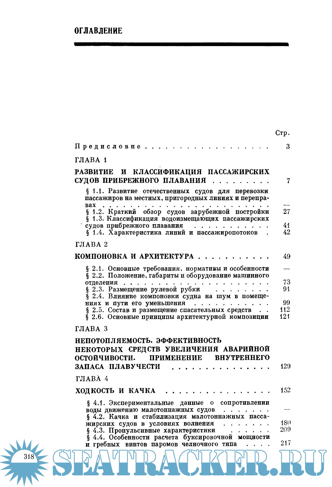 Предисловие. Развитие и классификация пассажирских судов прибрежного плавания. Компоновка и архитектура. Непотопляемость. Эффективность некоторых средств увеличения аварийной остойчивости. Применение внутреннего запаса плавучести. Ходкость и качка. Конструкция корпуса и технология постройки. Обоснование основных параметров пассажирских судов прибрежного плавания и определение их экономической эффективности при проектировании. Указатель литературы.