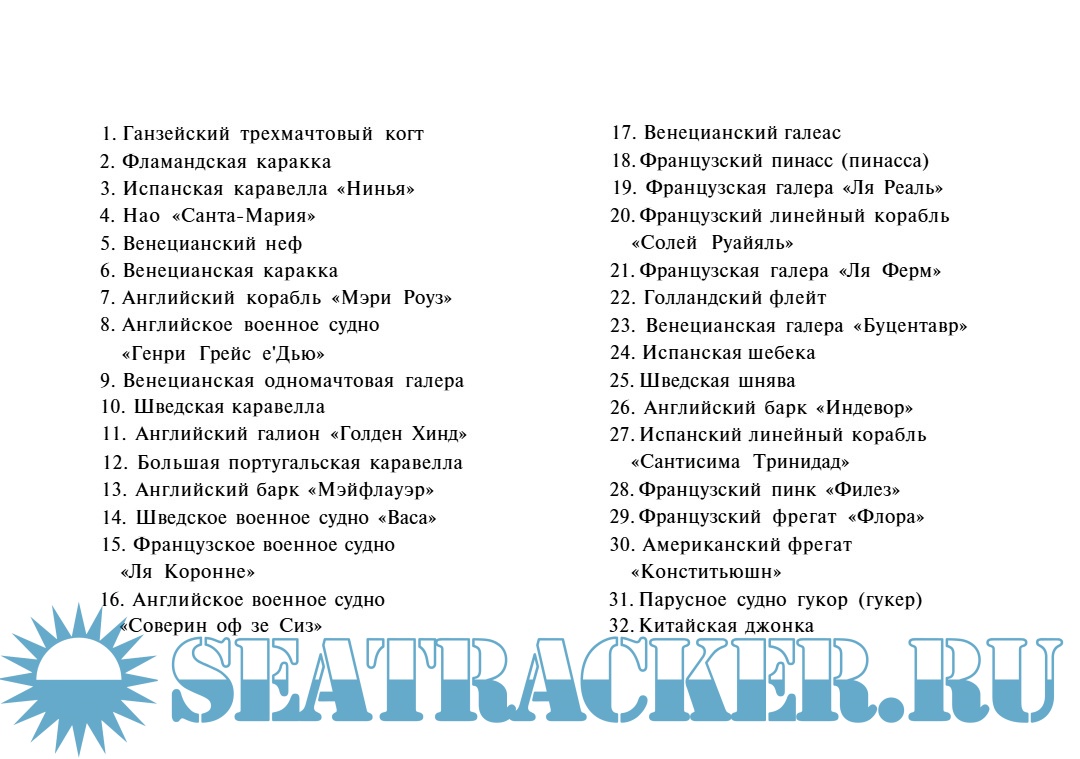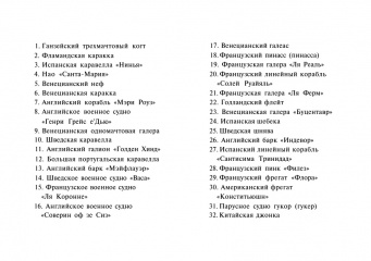 Выпуск 1 01. Египетский торговый корабль 02. Мореходное торговое судно Египта 03. Военный корабль Египта 04. Финикийский торговый корабль 05. Финикийский военный корабль 06. Ассиро-финикийский боевой корабль 07. Ассиро-финикийский торговый корабль 08. Корабль Эгейского моря (о. Крит) 09. Судно этрусков 10. Греческий торговый корабль 11. Римская трирема (триера) 12. Римская пентера (пентекотера) 13. Римская бирема 14. Греческая бирема 15. Римская галера 16. Римский торговый корабль 17. Североевропейский дромон 18. Русская боевая лодья (ладья) 19. Гокштадский корабль (дракар) 20. Средиземноморское судно 21. Венецианское грузовое судно 22. Корабль Вильгельма Завоевателя 23. Генуэзский торговый корабль 24. Норманнский шнеккер 25. Древняя китайская джонка 26. Норманнский кнорр 27. Французский торговый корабль 28. Ганзейский когг 29. Датский военный корабль 30. Торговое судно Северной Европы 31. Английский купеческий корабль 32. Корабль Ричарда III Выпуск 2 01. Ганзейский трехмачтовый когт 02. Фламандская каракка 03. Испанская каравелла «Нинья» 04. Нао «Санта'Мария» 05. Венецианский неф 06. Венецианская каракка 07. Английский корабль «Мэри Роуз» 08. Английское военное судно «Генри Грейс е'Дью» 09. Венецианская одномачтовая галера 10. Шведская каравелла 11. Английский галион «Голден Хинд» 12. Большая португальская каравелла 13. Английский барк «Мэйфлауэр» 14. Шведское военное судно «Васа» 15. Французское военное судно «Ля Коронне» 16. Английское военное судно «Соверин оф зе Сиз» 17. Венецианский галеас 18. Французский пинасс (пинасса) 19. Французская галера «Ля Реаль» 20. Французский линейный корабль «Солей Руайяль» 21. Французская галера «Ля Ферм» 22. Голландский флейт 23. Венецианская галера «Буцентавр» 24. Испанская шебека 25. Шведская шнява 26. Английский барк «Индевор» 27. Испанский линейный корабль «Сантисима Тринидад» 28. Французский пинк «Филез» 29. Французский фрегат «Флора» 30. Американский фрегат «Конститьюшн» 31. Парусное судно гукор (гукер) 32. Китайская джонка Выпуск 3 01. Новгородское судно 02. Линейный корабль «Ингерманланд» 03. Ладья поморская 04. Пакетбот «Св. Петр» 05. Коч поморский 06. Линейный корабль «Евстафий» 07. Первый русский парусный 08. Линейный корабль «Трех Иерархов» 09. Корабль «Фредерик» 10. Брандер Ильина 11. Ботик Петра I 12. Учебный фрегат «Надежда» 13. Архангельское торговое судно 14. Бомбардирский корабль 15. Парусно-гребной фрегат «Апостол Петр» 16. Линейный корабль «Слава Екатерины» 17. Фрегат «Петр и Павел» 18. Линейный корабль «Св. Павел» 19. Корабль «Гото Предестинация» 20. Шлюп «Восток» 21. Шкоут марсельный 22. Линейный корабль «Азов» 23. Шкоут крюйсельный 24. Бриг «Меркурий» 25. Фрегат «Штандарт» 26. Фрегат «Паллада» 27. Полугалера (скампавея) 28. Линейный корабль «Двенадцать апостолов" 29. Галера «Двина» 30. Линейный корабль «Императрица Мария" 31. Шнява "Мункер" 32. Яхта "Нева"