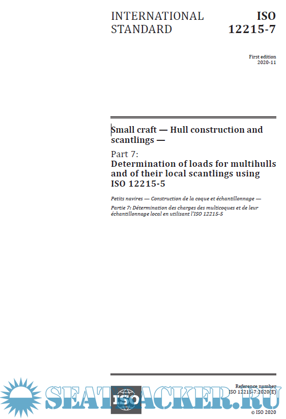 Description: SO 12215-7:2020 is part of the ISO 12215 series that sets international standards for the structural design and construction of small craft. This specific part (Part 7) focuses on multihull vessels—such as catamarans and trimarans—up to 24 meters in hull length. It provides guidelines for determining the design loads acting on multihull craft, taking into account their unique geometry and load distributions. The standard supports structural engineers, naval architects, and builders in ensuring safety, reliability, and compliance in multihull construction, and it aligns with the overall performance and safety objectives defined in the ISO 12215 framework.