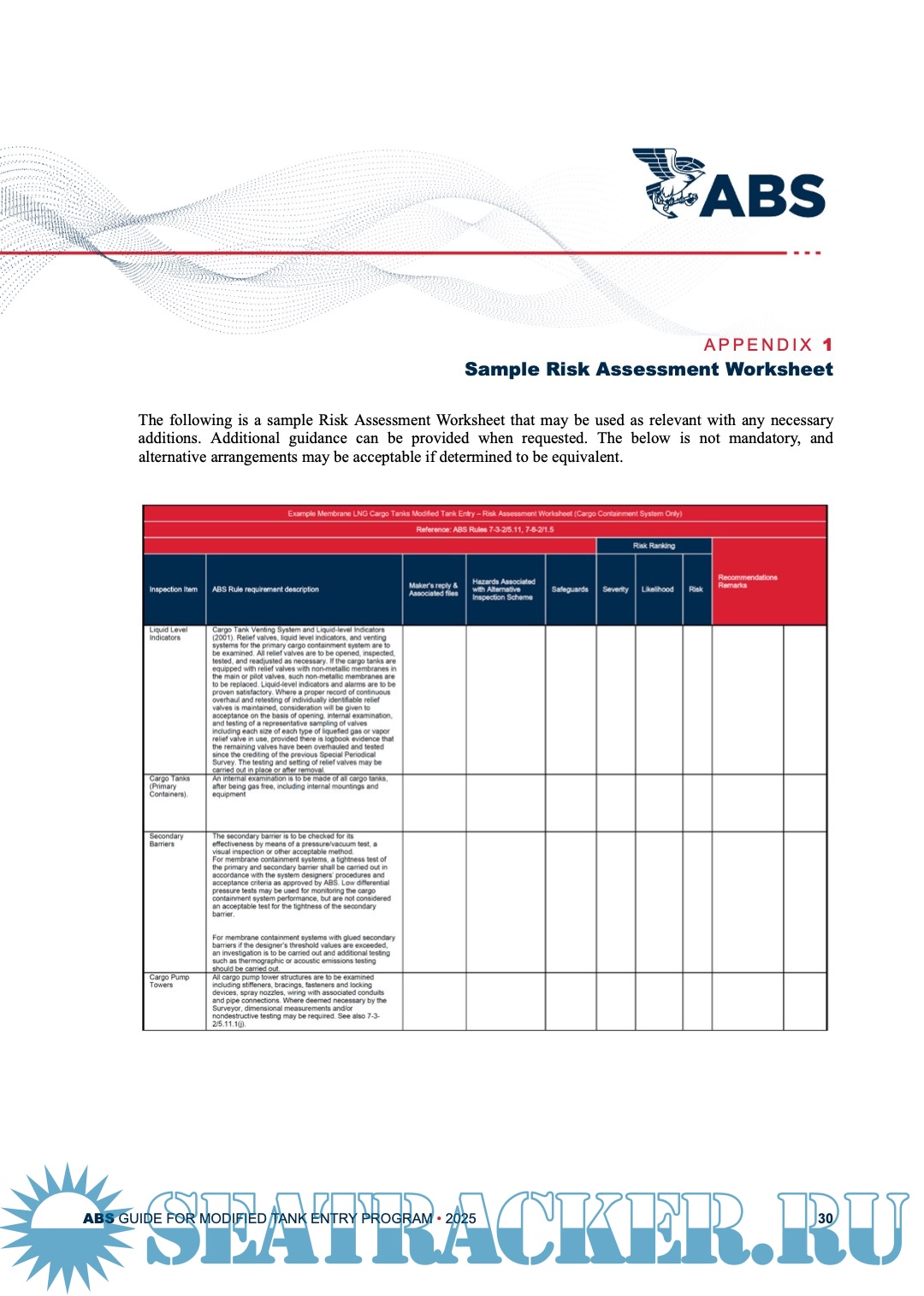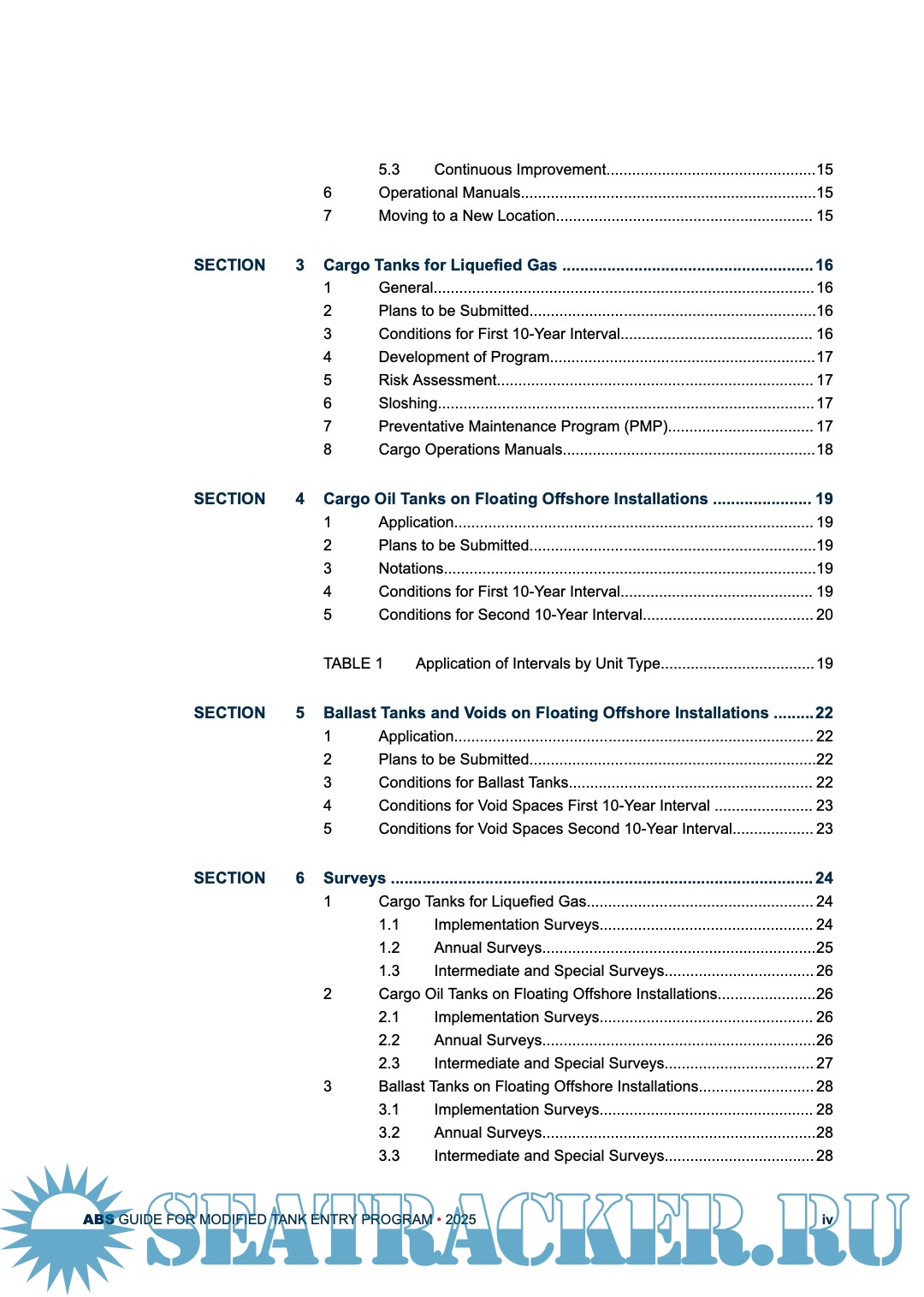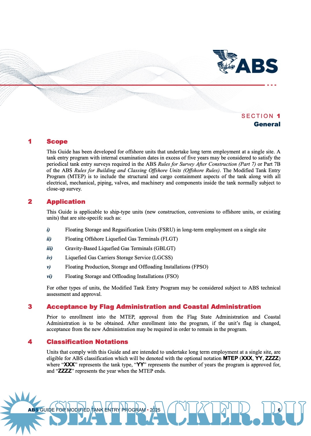 Year: 2025 Language: English Author: ABS Genre: Methodological guide Publisher: ABS Format: PDF Quality: eBook Pages count: 32 Description: The intent of this Guide for Modified Tank Entry Program is to provide requirements for prolonging the tank entry beyond the conventional five-year intervals for site-specific units such as Floating Storage and Regasification Units (FSRUs) when engaged in long-term employment on a single site, Floating Production and Storage and Offloading Installations (FPSOs), Floating Storage and Offloading Installations (FSOs), and Floating Offshore Liquefied Gas Terminals (FLGTs). Where a unit is proposed to undertake long term employment at a single site, a tank entry program utilizing alternative means to credit surveys with examination dates in excess of five years may be considered to satisfy the periodical tank entry surveys required in the ABS Rules for Survey After Construction (Part 7). This Guide is for the use of designers, builders, owners and operators and specifies the ABS requirements for obtaining the optional notation MTEP. This Guide becomes effective on the first day of the month of publication.