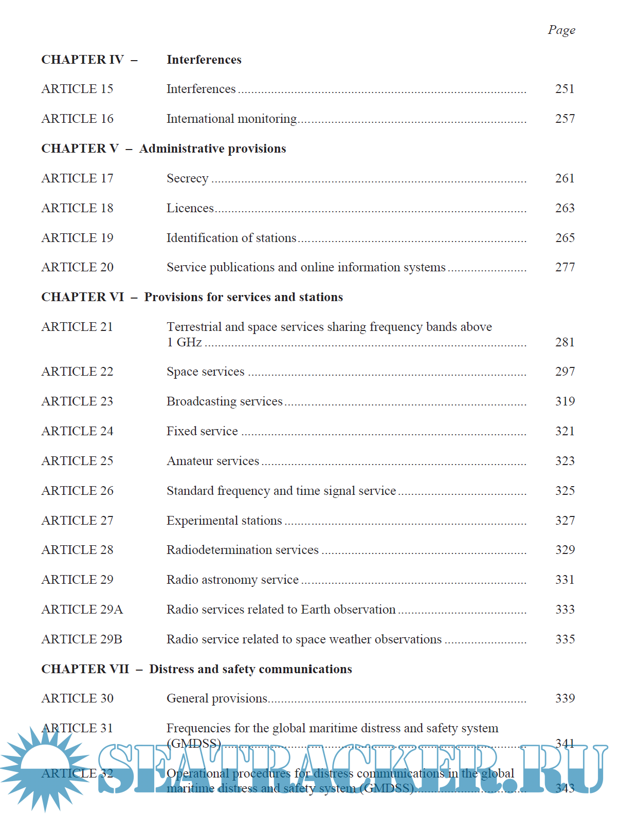 Year: 2024 Language: English Author: ITU Format: PDF Quality: Scanned pages + text layer Pages count: 453 Description: The Radio Regulations, Edition of 2024, contains the complete texts of the Radio Regulations adopted by the World Radiocommunication Conference of 1995 (WRC-95) and reviewed by the subsequent World Radiocommunication Conferences: WRC-97 (Geneva, 1997), WRC-2000 (Istanbul, 2000), WRC-03 (Geneva, 2003), WRC-07 (Geneva, 2007), WRC-12 (Geneva, 2012), WRC-15 (Geneva, 2015), WRC-19 (Sharm el-Sheik, 2019) and WRC-23 (Dubai, 2023).