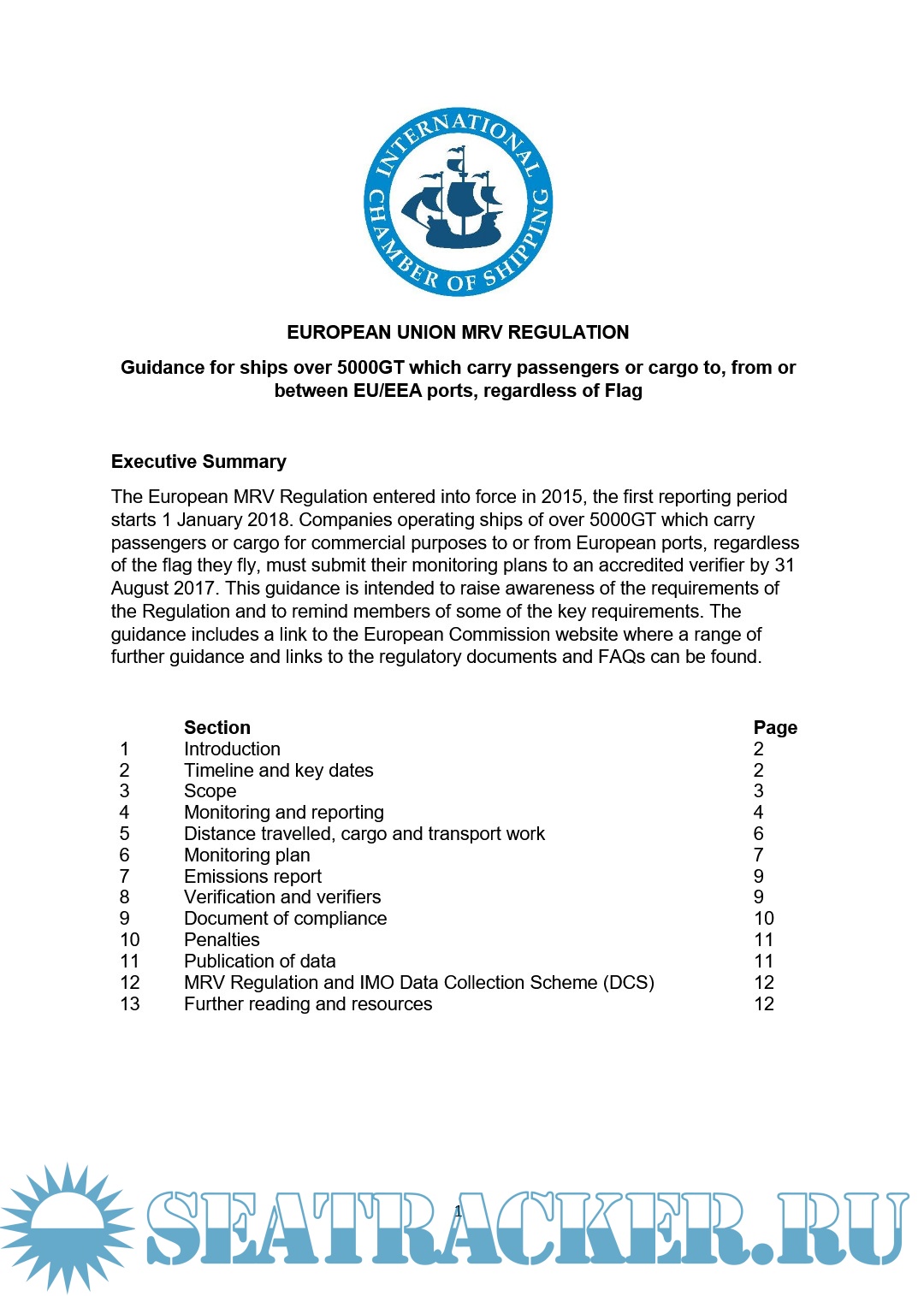 1 Introduction ........................................... 2 2 Timeline and key dates ................................. 2 3 Scope .................................................. 3 4 Monitoring and reporting ............................... 4 5 Distance travelled, cargo and transport work ........... 6 6 Monitoring plan ........................................ 7 7 Emissions report ....................................... 9 8 Verification and verifiers.............................. 9 9 Document of compliance ................................. 10 10 Penalties ............................................. 11 11 Publication of data ................................... 11 12 MRV Regulation and IMO Data Collection Scheme (DCS) ... 12 13 Further reading and resources ......................... 12