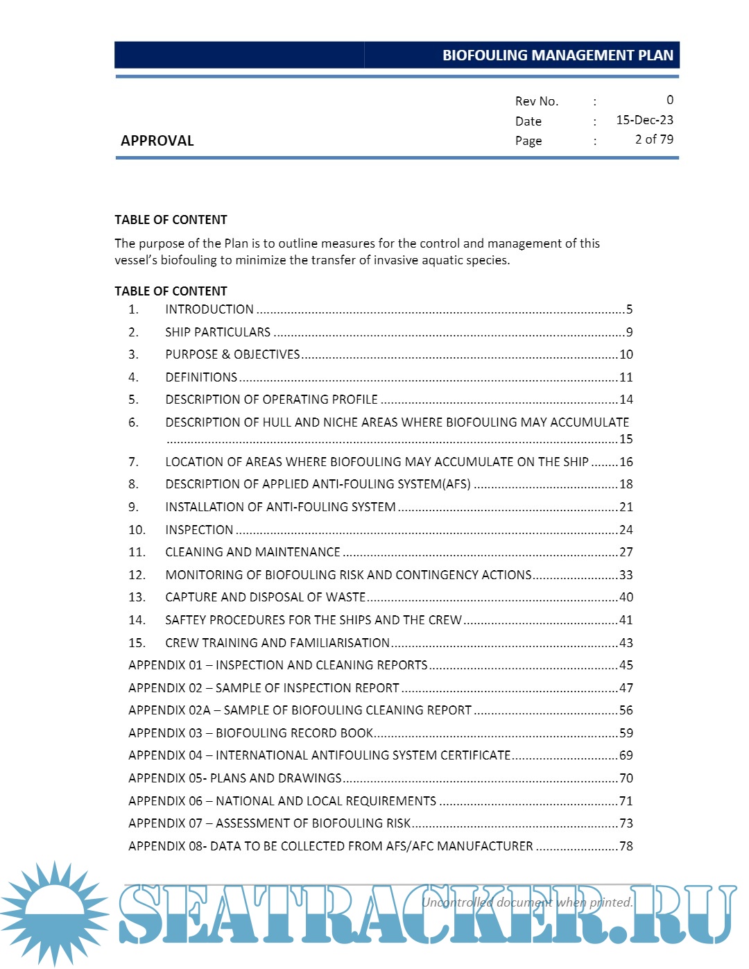 Year: 2023 Language: English Author: Synergy Maritime Pvt. Ltd. Genre: Manual Edition: 2 Format: PDF Quality: eBook Pages count: 79 Description: The purpose of the Plan is to outline measures for the control and management of this vessel’s biofouling to minimize the transfer of invasive aquatic species. This plan describes the biofouling management for the period between two scheduled drydockings which include application, reapplication, installation, or renewal of the AFS. The plan should be re-evaluated and, if necessary, updated after a dry-docking and/or if any changes are made that have an impact on the anticipated biofouling.