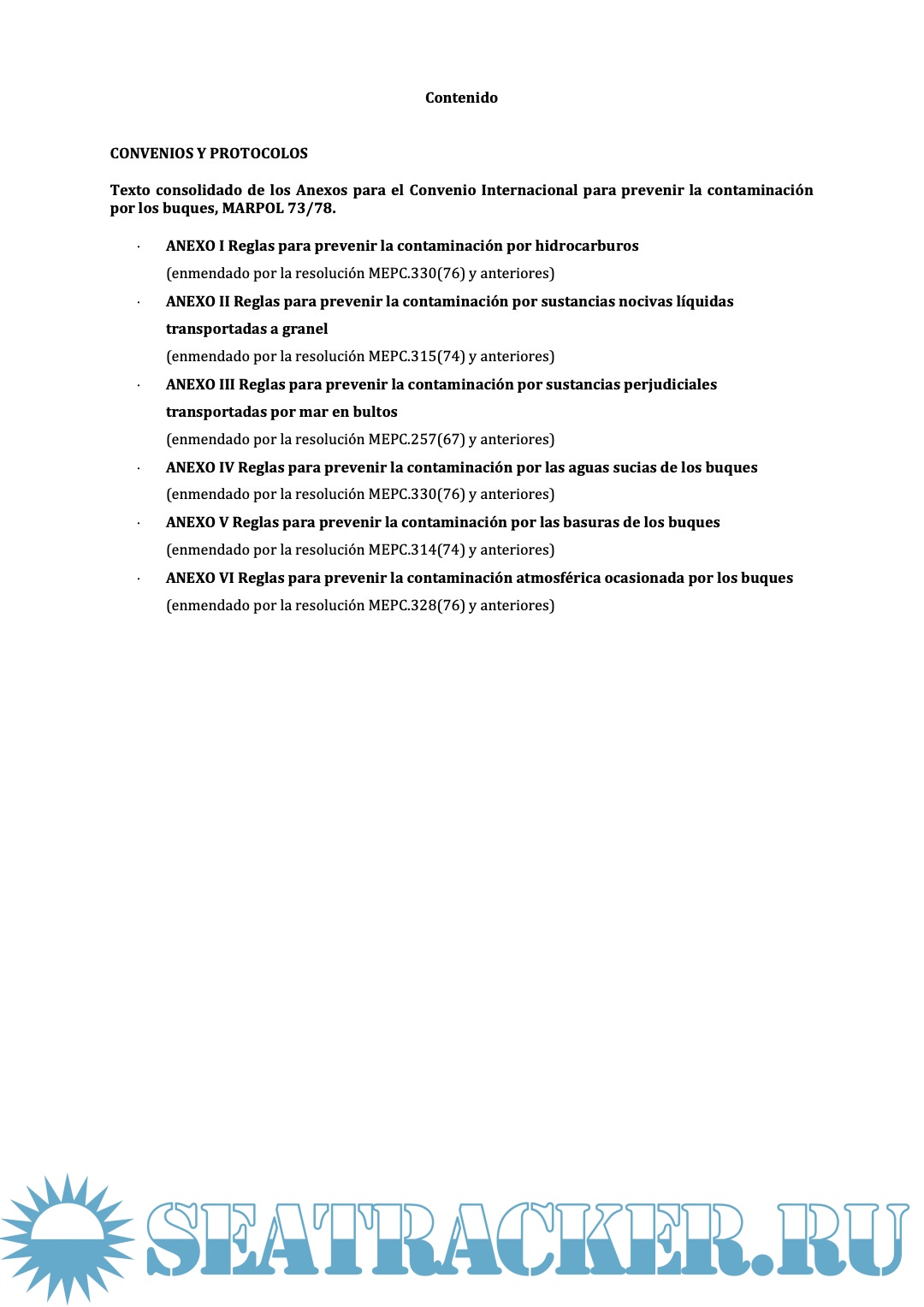Este texto ha sido consolidado por la Subdirección General de Seguridad, Contaminación e Inspección Marítima de la Dirección General de Marina Mercante. Recogiendo todas las enmiendas al Convenio hasta el MEPC 76, mediante documentos oficiales OMI y publicaciones BOE, llevado a cabo todos los esfuerzos para evitar errores y reproducir los textos originales fielmente. Aun así, los lectores deberán ser conscientes que los textos de la OMI y del BOE prevalecerán en caso de discrepancias