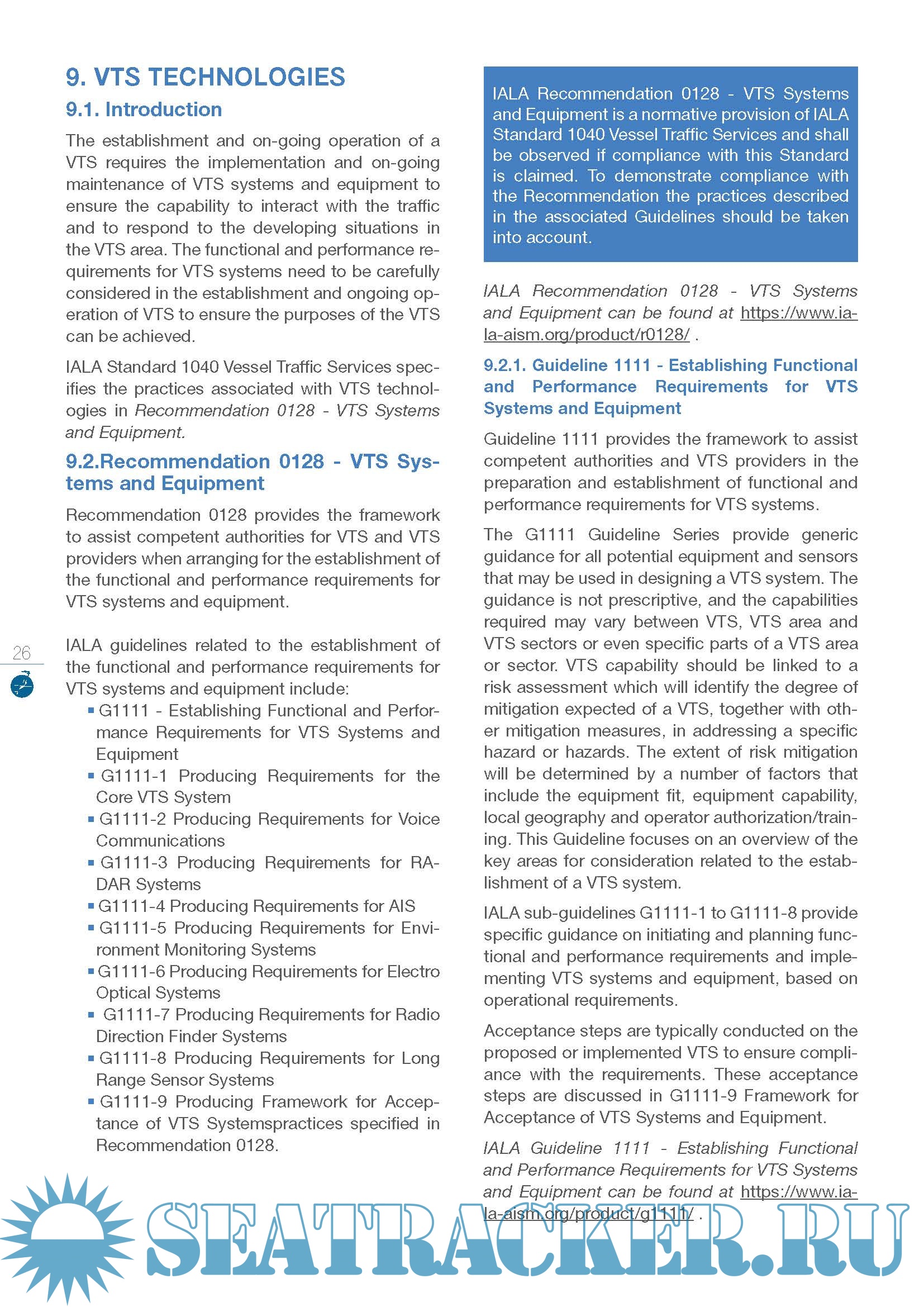 The Manual provides a source of reference on the establishment and provision of VTS for all stake-holders. It also provides a pointer to the suite of IALA Standards related to VTS and the associated Recommendations, Guidelines, Model Courses that any VTS professional may seek.