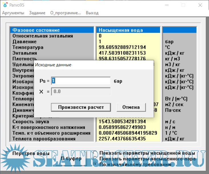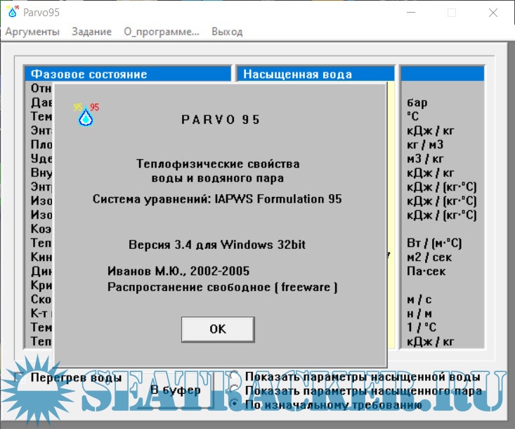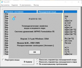 Год выпуска: 2005 Версия: 3.4 (Windows 32-bit) Разработчик: Иванов М. Ю. Платформа: Windows Совместимость с 64-битными ОС: да Системные требования: Windows (32-bit) Язык интерфейса: Русский Таблэтка: Не требуется Название: Теплофизические свойства воды и водяного пара Система уравнений: IAPWS Formulation 1995 Лицензия: Бесплатное распространение (Freeware) Описание: Программа предназначена для расчёта и анализа теплофизических свойств воды и водяного пара в широком диапазоне температур и давлений на основе международной научной модели IAPWS-95 (International Association for the Properties of Water and Steam). С помощью данного приложения можно точно определить такие параметры, как: