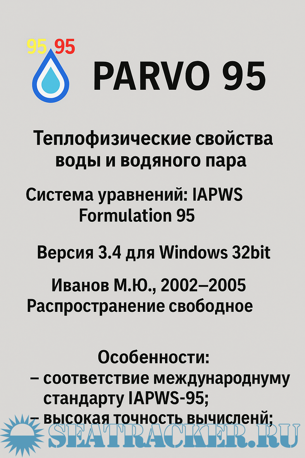 Описание: Программа предназначена для расчёта и анализа теплофизических свойств воды и водяного пара в широком диапазоне температур и давлений на основе международной научной модели IAPWS-95 (International Association for the Properties of Water and Steam).