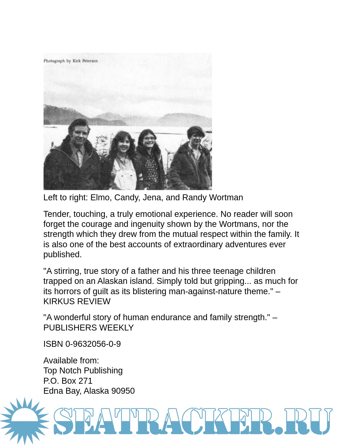 Year: 1981 Language: English Author: Wortman E. Genre: Historical Publisher: Top Notch Pub Format: PDF, EPUB Quality: eBook Pages count: 227 Description: Four Against the Wilderness: The True Story of a Father and His Three Teenage Children Shipwrecked Off the Coast of Alaska in Winter