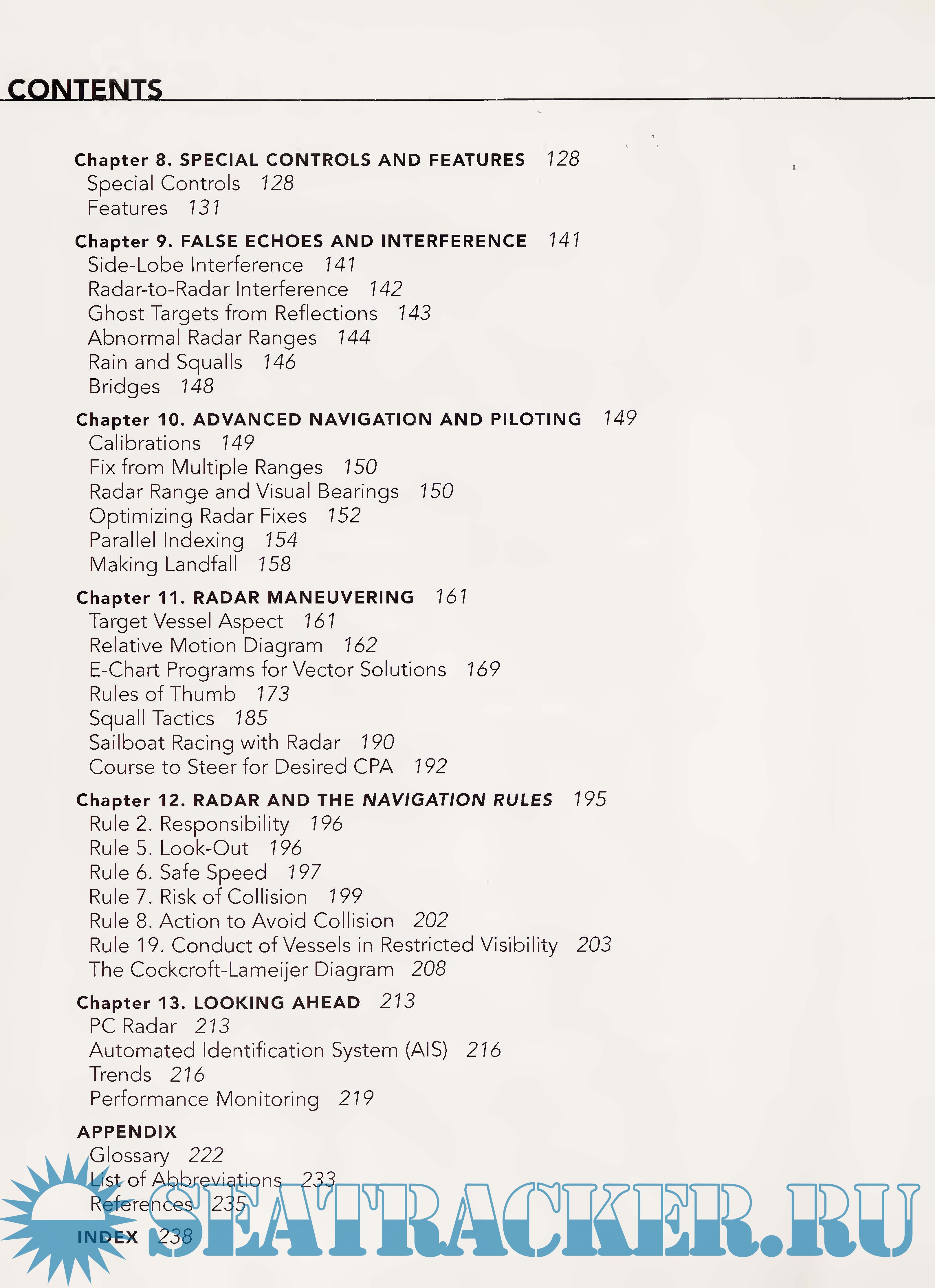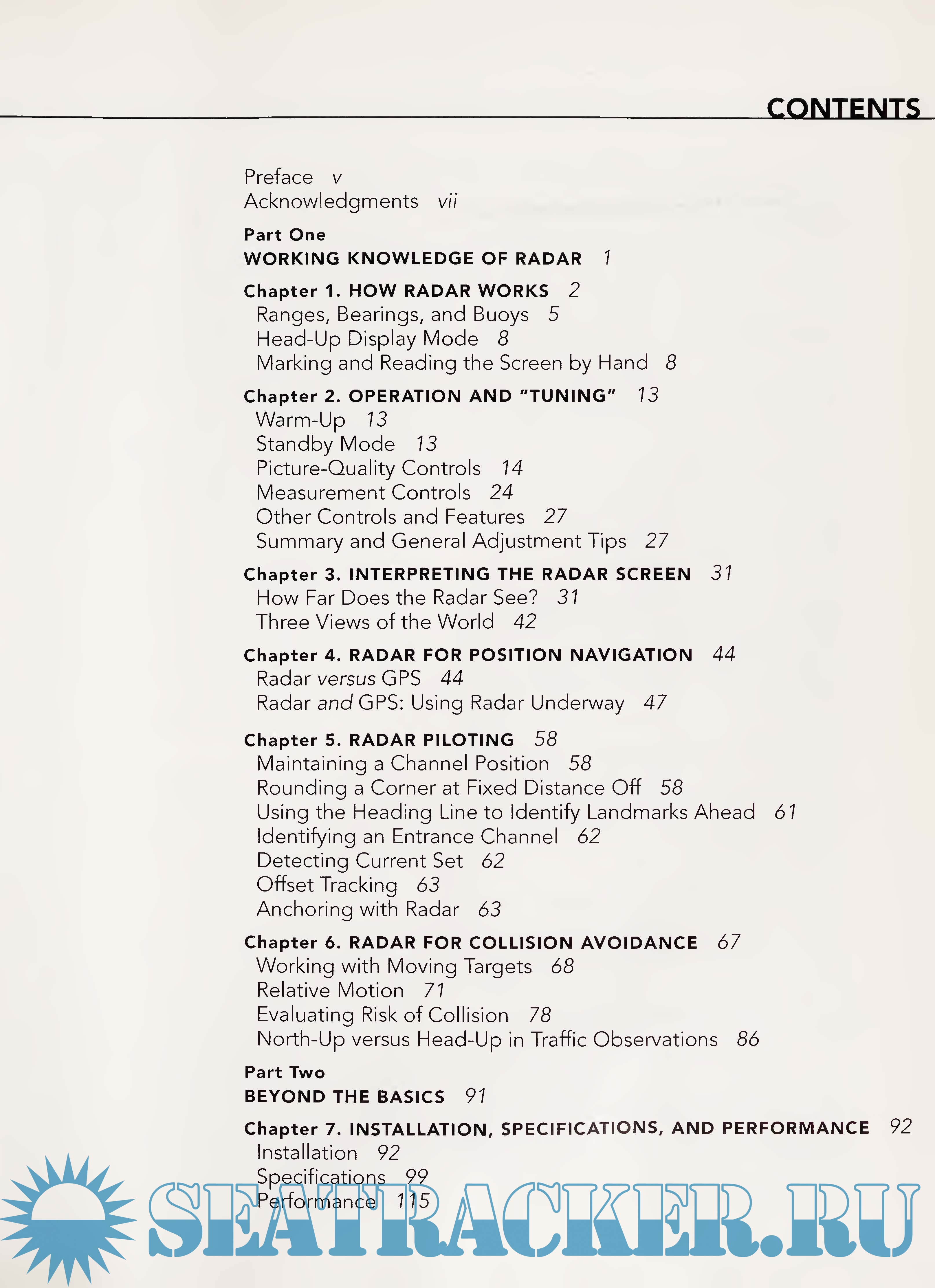 Year: 2005 Language: english Author: David Burch Genre: Guide Publisher: International Marine Edition: 1st 2005 ISBN: 0-07-139867-8 Format: PDF Quality: OCR without errors Pages count: 252 Description: Become an Expert Small-Craft Radar Operator! Nothing beats radar for guiding your boat through the darkest night or the thickest fog. Radar enables you to plot a fix from just a single buoy or landmark, and it is the only navigation tool that tells you not just where you are, but who else or what else is out there with you. Today's smaller, affordable, efficient radars make more sense than ever for sailors and powerboaters. Adopted by the American Sailing Association for their radar course and used by professional and recreational radar training schools around the world, this complete, in-depth manual shows you how to: - Choose the best radar model for your sailboat or powerboat - Install, adjust, and operate your system - Interpret the images on your radar screen - Pilot your boat and track the movements of vessels around you - Use radar to track and avoid squalls, outmaneuver competitors in a yacht race, and other specialized tasks - Interface your radar with a digital compass, GPS, or electronic chart
