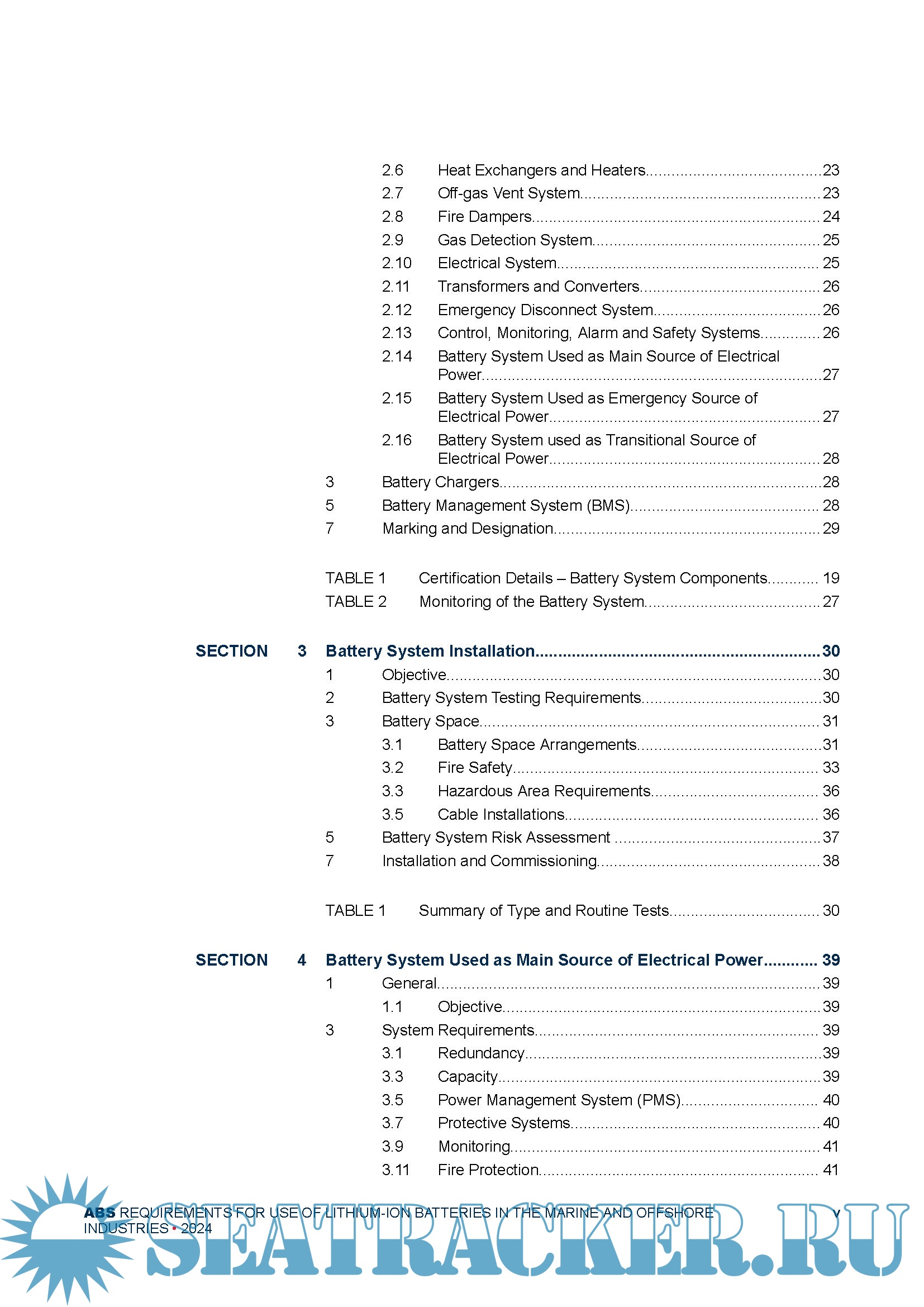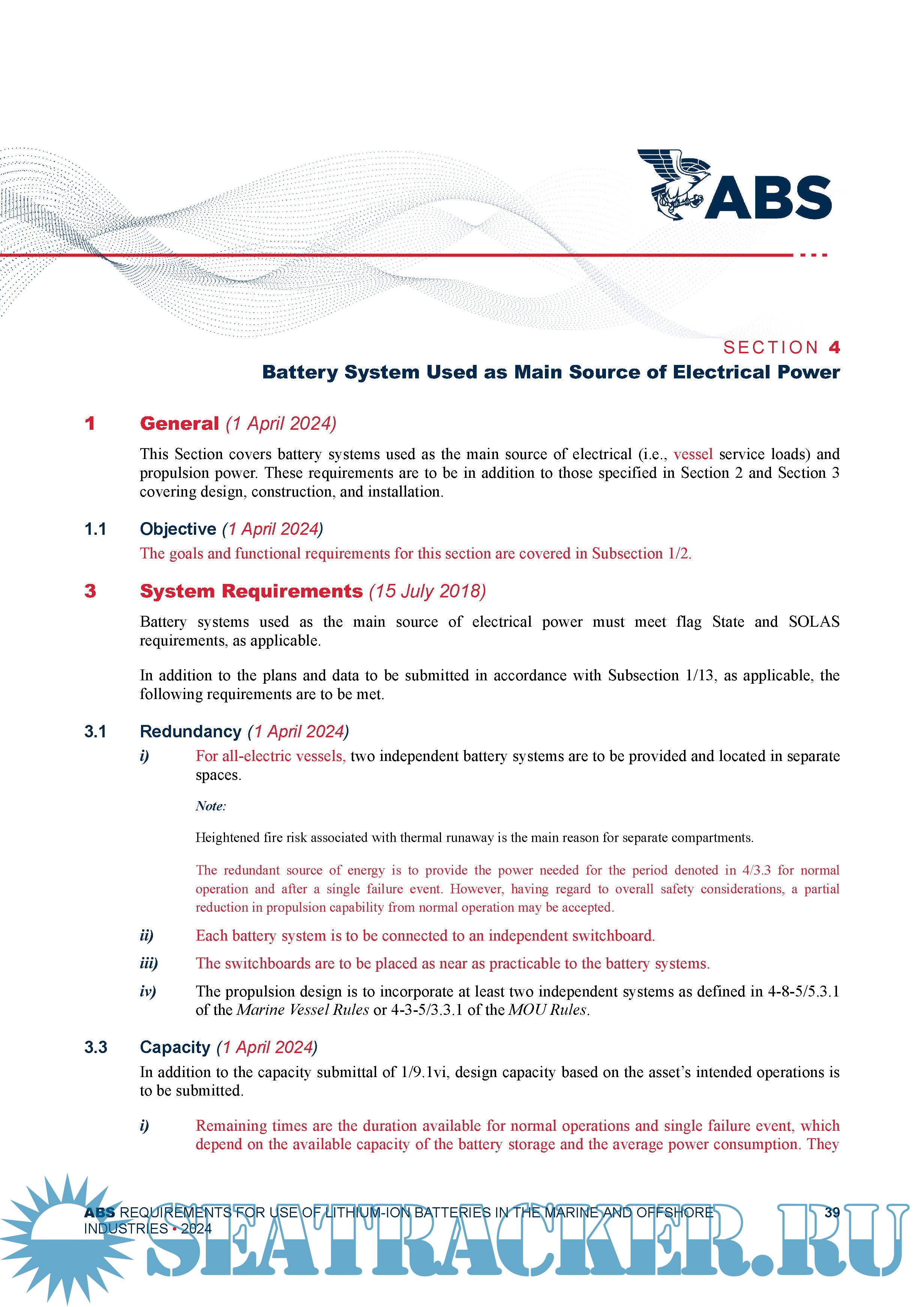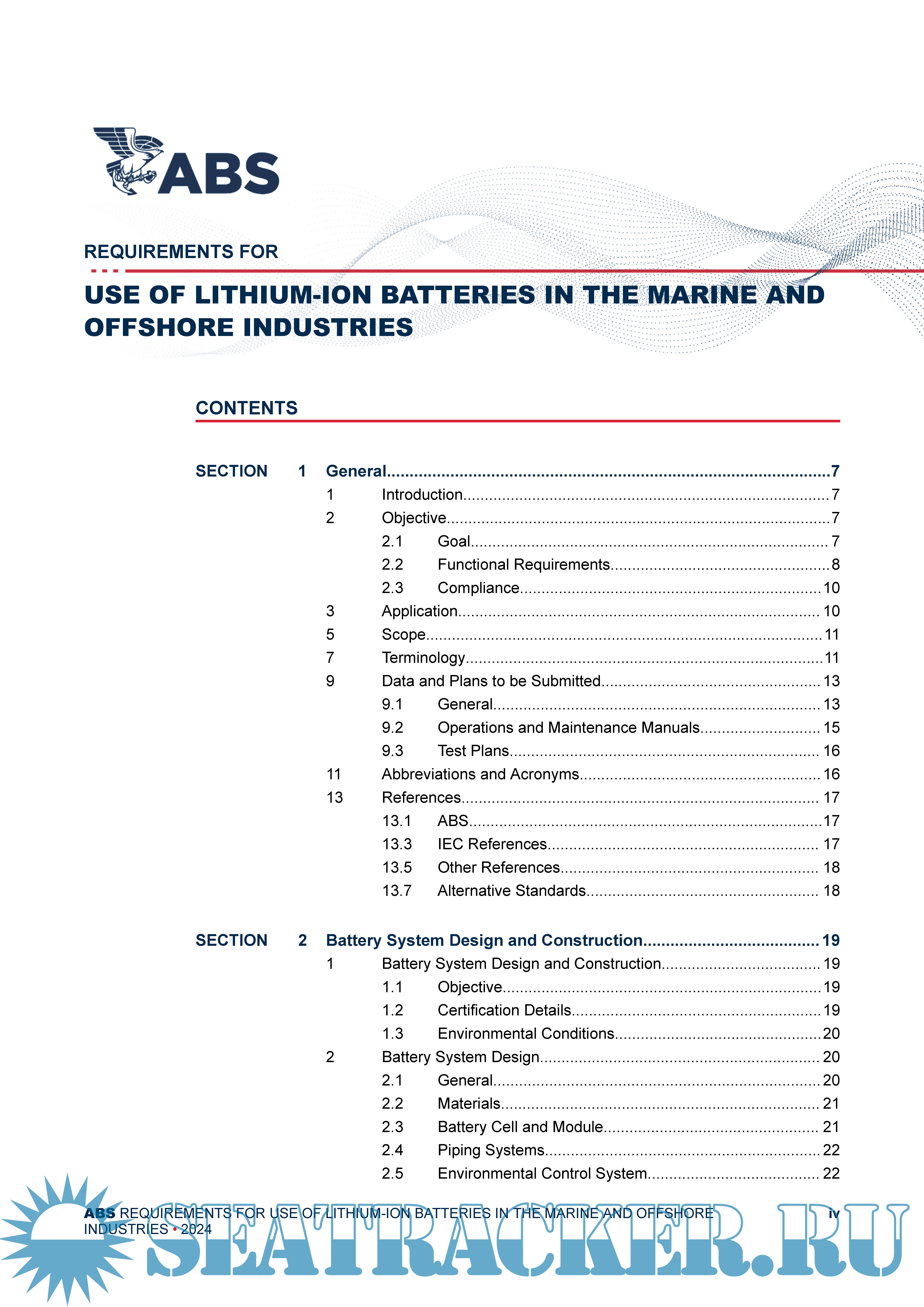 Year: 2024 Language: English Author: American Bureau of Shipping (ABS) Genre: Textbook Edition: September 2024 Format: PDF Quality: eBook Pages count: 52 Description: This document has been developed to facilitate the effective installation and operation of lithium-ion (Liion) batteries. The document establishes safety guidelines for owners, operators, shipyards, designers, and manufacturersfor marine systems. The September 2024 edition includes updates to battery material testing requirements for flammability, clarification for battery overcharge/overcurrent protection, updates to off-gas vent system fan redundancy requirements, off-gas vent system integrated to the battery system, battery system creepage and clearance distances, Fixed Fire Extinguishing System (FFES) requirements, battery space location contiguous to side shell, and updates to figures in Appendix 1.