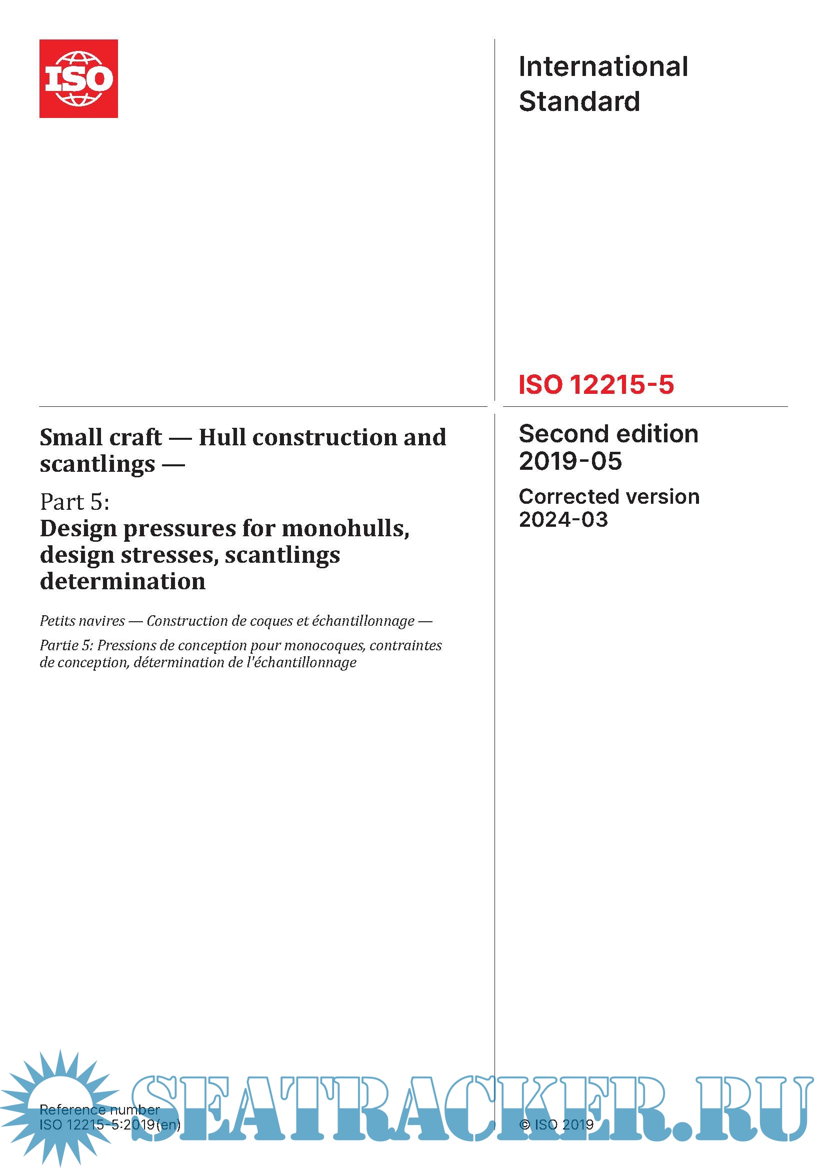 Year: 2024 Language: English Author: ISO Genre: Нормативный документ Publisher: ISO Edition: 2nd edition / Corrected version Format: PDF Quality: eBook Number of pages: 136 Description: The committee responsible for this document is ISO/TC 188, Small craft. This second edition cancels and replaces the first edition (ISO 12215-5:2008, including its amendment ISO 12215-5:2008/Amd 1:2014), which has been technically revised. One of the main reasons to achieve this revision, after a decade implementing the first edition, was to allow other scantlings calculation methods than those given in the 2008 edition, noting the huge development of finite element analysis methods and software, and the trend already applied in ISO 12215-9 (keels and appendages) and ISO 12215-7 (multihulls). Therefore, in this new edition, like in many other scantlings standards, the design pressure loads, and the design stresses are given in the main body of the standard and, where needed, the scantlings calculation methods are detailed in Annexes. The main changes compared to the previous edition are as follows: — clarification of the scope and of many definitions, dimensions, and assessment; — definition of a theoretical hull/deck limit height ZSDT in Table 3; — renaming of nGC into kDYN in Table 7; — lowering of the values of kL in the aft part of the craft in Table 8; — deletion of kAR min, to better consider large panels, mainly sandwiches, in Table 9; — improvement of the values of kSUP in Table 10; — modification of design pressures for motor and sailing craft in Tables 12 & 13; — modification of design stresses introducing kBB and kAM factors in Tables 15 to 17; — incorporation of requirements for work boats in Table 2, Clause 12 and Annex J; — possibility to use a wider range of assessment methods detailed in Table 18; — move of the previous assessment method (now called "simplified") in Annex A; Additional info: This document defines the dimensions, design local pressures, mechanical properties and design stresses for the scantlings determination of monohull small craft with a hull length (LH) or a load line length (see NOTE 1) of up to 24 m. It considers all parts of the craft that are assumed to be watertight or weathertight when assessing stability, freeboard and buoyancy in accordance with ISO 12217.