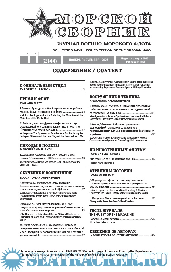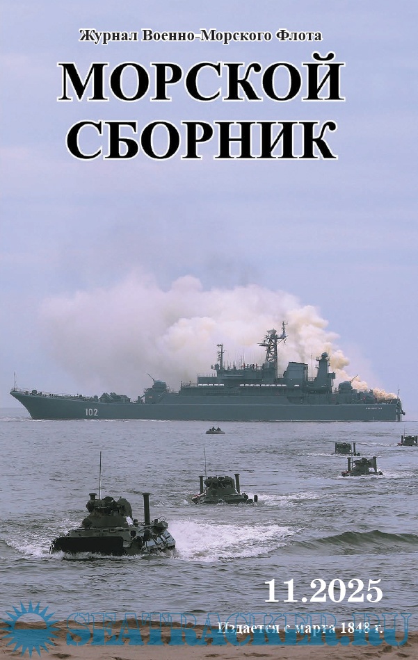 Описание: «Морской сборник» - официальный ежемесячный журнал Военно-морского флота Российской Федерации, но это не просто журнал, каких сегодня немало. «Морской сборник» - это срез отечественной истории, вместившей в себя её перипетии за последние полтораста лет и даже больше. В «Морском сборнике» публиковались также работы принесших славу России академиков, кораблестроителей, химиков, гидрографов и океанографов и многих других выдающихся деятелей науки. «Морской сборник», созданный для «распространения полезных сведений между служащими во флоте и вообще в морской службе», всегда стремился сообщать военнослужащим флота СССР и России об опыте передовых кораблей и соединений.