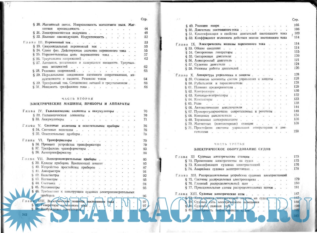 Третья часть посвящена электрическому оборудованию судов: генераторам, распределительным системам, кабельным сетям, заземлению, защитам, эксплуатации в морских условиях. В заключительной, четвёртой части, представлены практические указания, технологические процессы монтажа, ремонта и обслуживания электрического оборудования на судах, вопросы безопасности и особенностей морской эксплуатации. Книга снабжена схемами, чертежами и рисунками черно-белого исполнения, что делает её удобным справочным пособием как для учащихся морских училищ, так и для действующих специалистов.