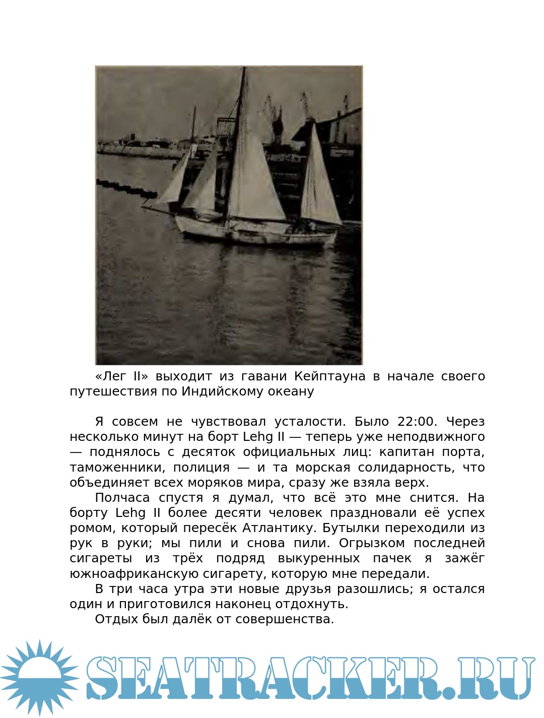 Описание: Дюма Вито (Dumas Vito) (1900-1965) аргентинский мореплаватель. В 1931 году во Франции приобрел яхту, названную им «Лег», и на ней в одиночку дошел из Аркашона (Франция) до родного Буэнос-Айреса. В 1942 году 27 июня на яхте «Лег II» он вышел из Буэнос-Айреса и через Кейптаун, Веллингтон, Вальпараисо, мыс Горн, Мар-дель-Плата совершил кругосветное одиночное плавание в ревущих сороковых широтах, завершив своё плавание 7 сентября 1943 года в Буэнос-Айресе. В дальнейшем он ещё дважды совершал трансатлантические одиночные плавания. Эта книга о его рекордной кругосветке, дополненная описанием плавания 1932 года.