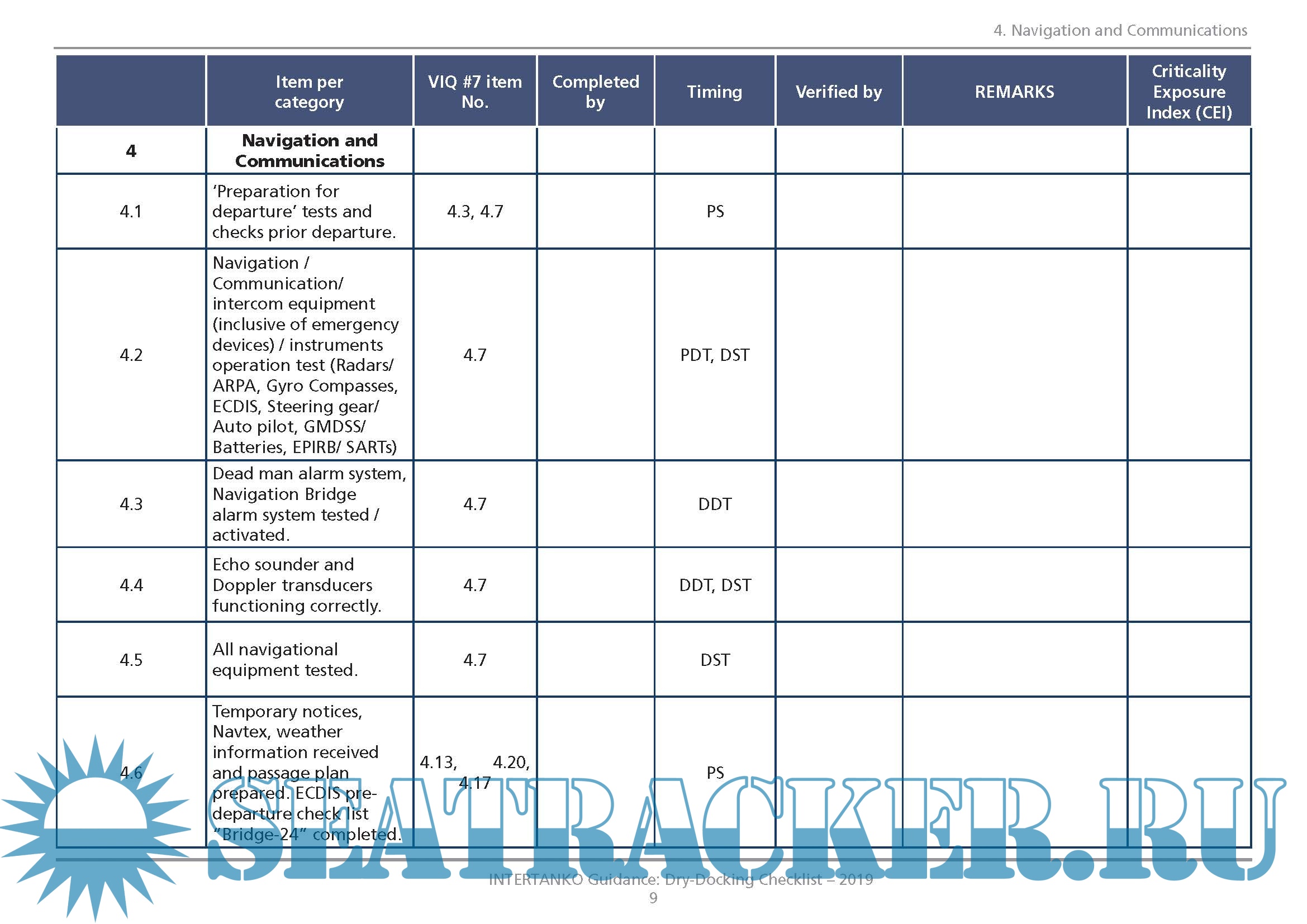 Year: 2019 Language: English Author: Intertanko Genre: Practical guide Publisher: Intertanko Edition: 2nd edition Format: PDF Quality: eBook Pages count: 34 Description: The Dry-Docking Checklist has been developed by the INTERTANKO Safety and Technical Committee (ISTEC) with the aim of improving the scope and extent of inspections during Dry-Dock activity. Its first edition, released in 2017, was reportedly used by many members and was considered a very useful tool. Its large use and practice enabled suggestions forwarded by Members to include additional items. Furthermore, there was a strong suggestion to add to it a new column that will include the result of the company Risk Assessment for each item to be checked and completed. Another important development was the new SIRE VIQ7 which included a reshuffle of the way it is organized. Since the Dry-Dock Check List makes a cross reference to each item according to the corresponding questions in VIQ, as appropriate, there was a need for a review. The cross reference is made to assist Vetting Inspectors in following the Dry-Dock inspection report. Consequently, ISTEC has agreed to issue this 2nd Edition with the following changes: • A review the content of the Dry-Dock Check List and addition of new items • Reorganization of various sections and development of the section on Ice Operations • Making of cross references to the new VIQ 7 questions, as appropriate • Adding of a new column to reflect the company’s Risk Assessment of the result of the check indicating the assessed Criticality Exposure Index (CEI) Additional info: The Dry-Dock Checklist is generic and can be used by INTERTANKO Members as they see appropriate. This Dry-Dock Checklist should be seen as a dynamic document, open to regular improvements as suggested by Members. There are some items that feature in more than one category, and with Members’ further screening and practice, one could hopefully agree to which category each item should be assigned.
