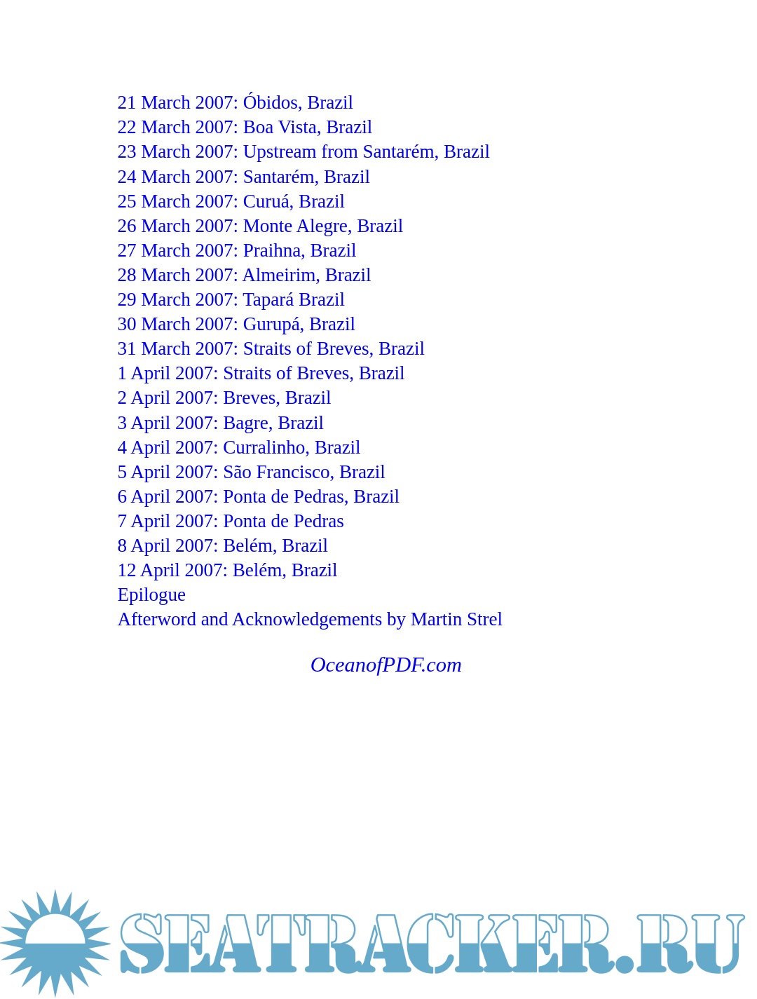 Year: 2007 Language: English Author: Strel M. Genre: Historical Publisher: Lyons Press ISBN: 9780857653239 Format: PDF, EPUB Quality: eBook Pages count: 229 Description: On Sunday, April 8, 200 7, 52-year old Martin Strel completed the first-ever swim of the 3,274-mile-long Amazon River. The Fish Man, as he was called by locals, almost died in the process several times; he encountered deadly piranha, crocodiles, anaconda, river sharks, blistering, relentless sun, dangerous currents, river pirates and drug runners, and the insidious candiru. At the finish his blood pressure was at heart attack level, his entire body full of subcutaneous larvae, and besieged by dehydration, diarrhea, and exhaustion. Strel, who holds multiple Guinness world records for long-distance river swims, undertook this epic Amazon swim to call attention to deforestation and river pollution. His journey was covered by national media around the world, and followed by tens of millions of readers on a website tracking his progress (www.amazonswim.com). A documentary film of his journey will premiere at the Sundance Film Festival in 2008. Drawn from the eloquent and evocative trip diaries of writer Matthew Mohlke, who guided Strel armed with buckets of blood to divert piranha, The Man Who Swam the Amazon is a gripping and inspirational story of perseverance, passion, and endurance: A real-life odyssey of a rare and driven man. Martin Strel is one of the most elite athletes in history. He holds three Guinness world records in distance swimming, and is about to earn his fourth for his Amazon swim. Matthew Mohlke is author of Floating Down the Country, an account of his Mississippi River paddling adventures.