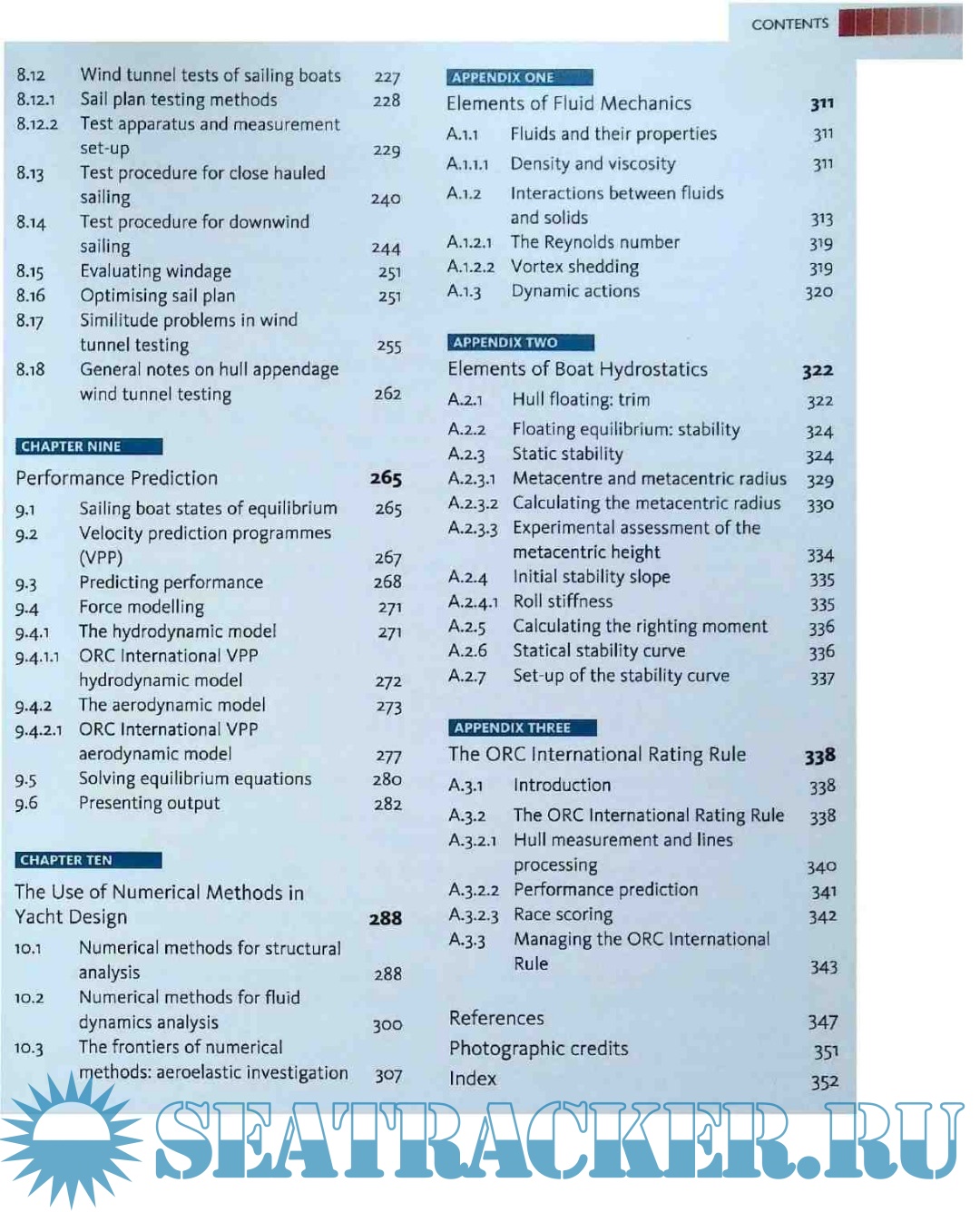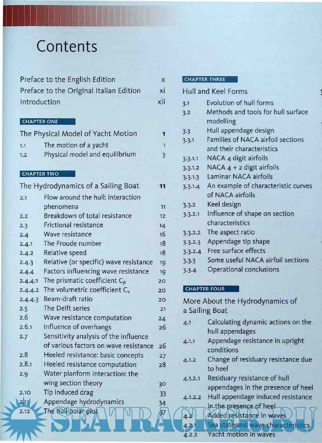 -The Physical model of yacht motion The hydrodynamics of a sailing boat Hull and keel forms More about the hydrodynamics of sailing boat Sailing boat aerodynamics Steady state dynamics of a sailing boat More about sailing yacht dynamics Physical model testing Performance prediction The use of numerical method in yacht design Elements of fluid mechanics Elements of boat hydrostatics The ORC international rating rule