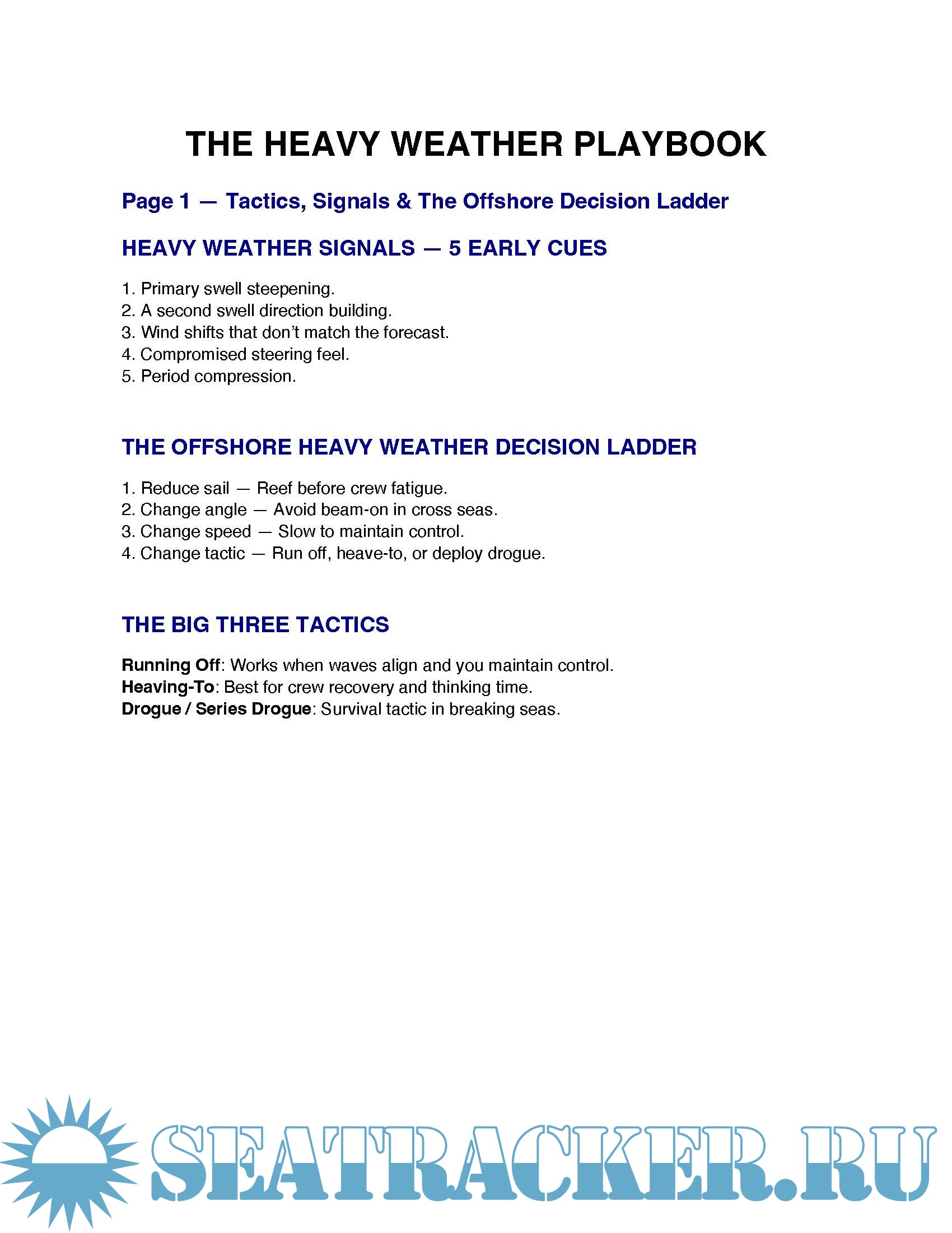 Either way, I wanted to send you something real. Not fluff. Not marketing. Just a tool you can actually use when the weather stops matching the forecast. The Heavy Weather Playbook is a two–page, no-BS reference I built from more than 90,000 miles at sea. This is the kind of sheet I wish someone had handed me before my first real offshore night.