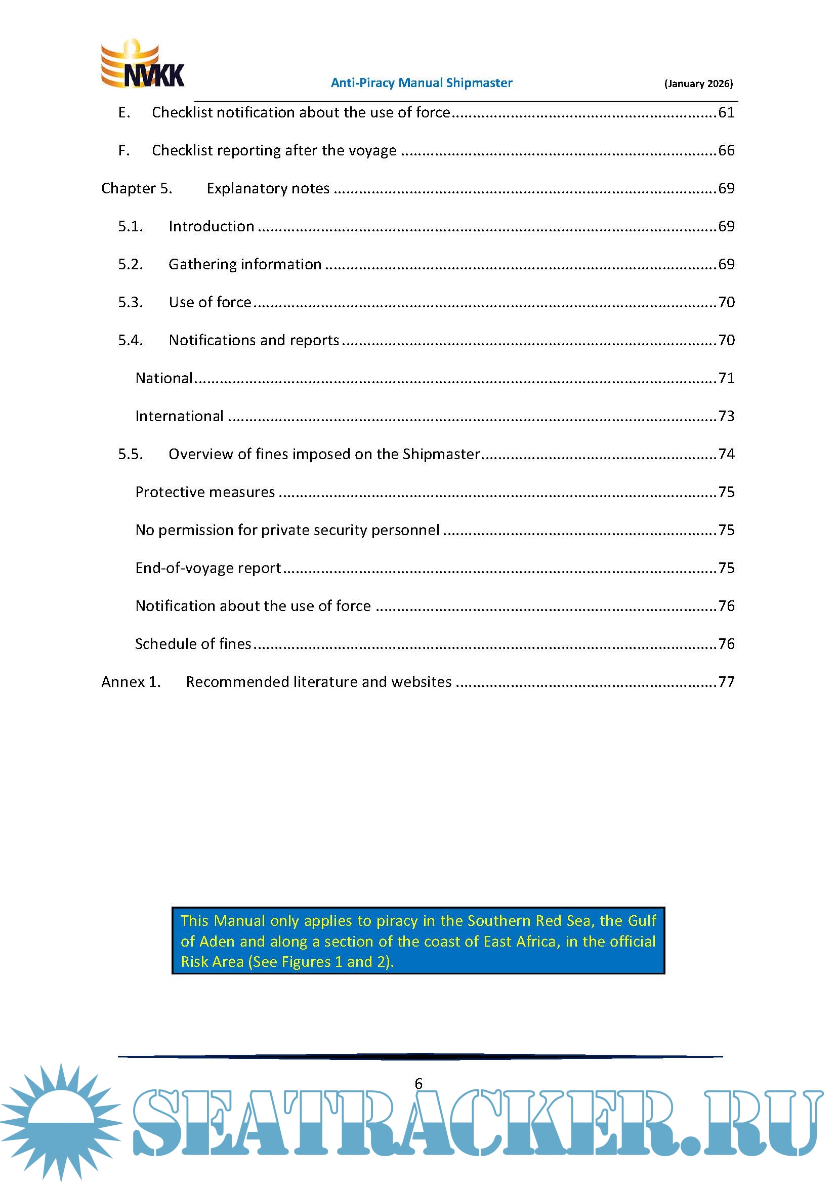 Additional info: This Manual only applies to piracy in the Southern Red Sea, the Gulf of Aden and along a section of the coast of East Africa, in the official Risk Area.