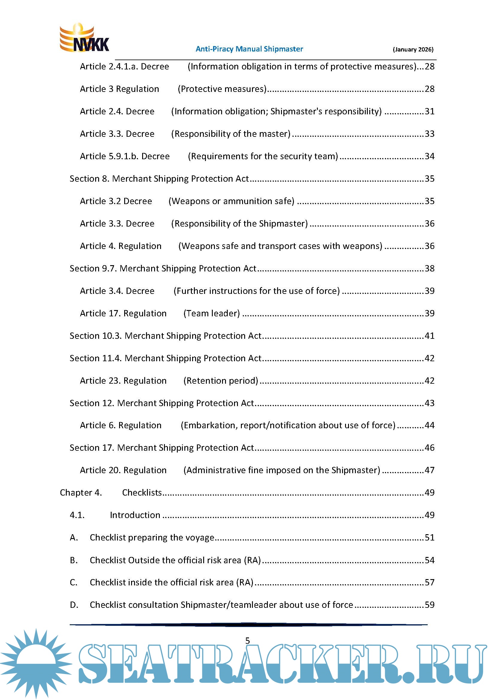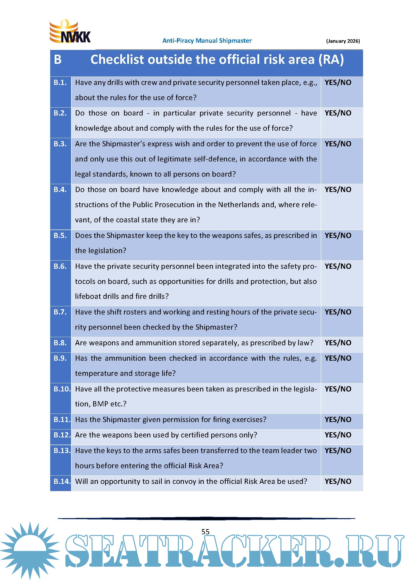 Year: 2026 Language: English Author: Peter van der Kruit Genre: Manual Publisher: Netherlands Shipmasters’ Association (NVKK) Edition: 3rd Updated Digital edition (January 2026) Format: PDF Quality: eBook Pages count: 80 Description: This Manual applies only and specifically to piracy in the southern Red Sea, the Gulf of Aden and along part of the coast of East Africa, so in the official and legal risk area. See Figure 2 for the actual risk area for piracy. However, many more maritime crimes and even acts of war occur in that region. Here too, the Shipmaster has a great responsibility for his ship and crew. These other maritime crimes and acts of war are briefly described in this Introduction, including the area where they are contended. Then some recommendations will be made for the Shipmaster to address the other maritime crimes and acts of war. Anti-Piracy Manual for the Shipmaster of a ship flying the flag of the Netherlands. A practical, legal reference work for the Shipmaster to help protect his ship and those on board against pirates in the Gulf of Aden and along a section of the coast of East Africa, in the official Risk Area. This practical Manual, with a large number of uniquely numbered checklists, is intended for masters of ships sailing under the Dutch flag, who may encounter piracy during their voyage. From the preparation of the voyage to the final mandatory travel reports, the shipmaster are guided in their task. The core of this Manual is formed by a number of uniquely numbered checklists to make sure the shipmaster does not forget anything. Furthermore, a number of important subjects are discussed, such as the use of force, notifications and reports, fines, etc. This manual is primarily for the shipmaster, but it is also recommended to all other seafarers and interested parties, such as ship managers, trade unions, educational institutions and the government. Additional info: This Manual only applies to piracy in the Southern Red Sea, the Gulf of Aden and along a section of the coast of East Africa, in the official Risk Area. :
