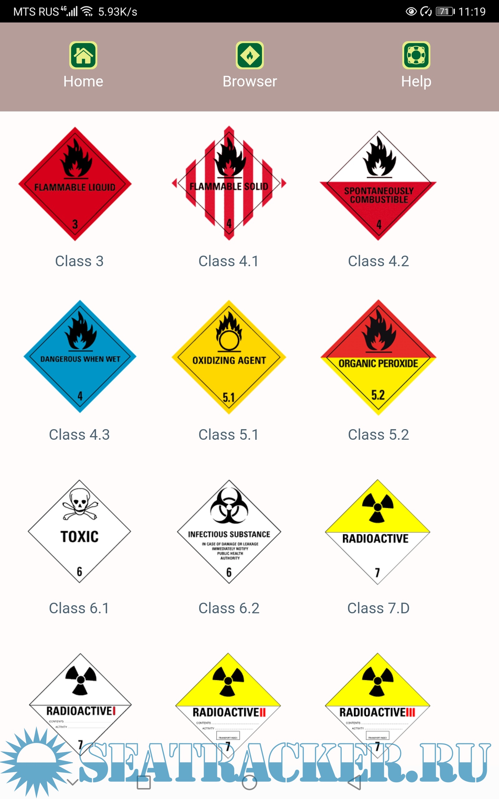 The placard browser explains the 9 classes of dangerous goods, and contains also a number of examples of labeling on packages and containers. We also made reference to the EmS Fire and Spillage codes. These codes are click-able and in a pop-up the F and S schedules are available.