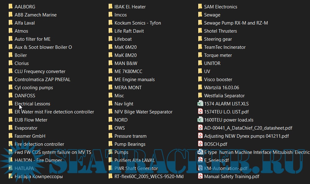 Description: The collection is a structured set of technical documentation covering shipboard machinery and onboard systems used on sea and river vessels. The materials are intended for marine engineers, electro-technical officers, motormen, service technicians, and maritime students. All documents are organized for practical use during operation, maintenance, troubleshooting, and repair of ship equipment.