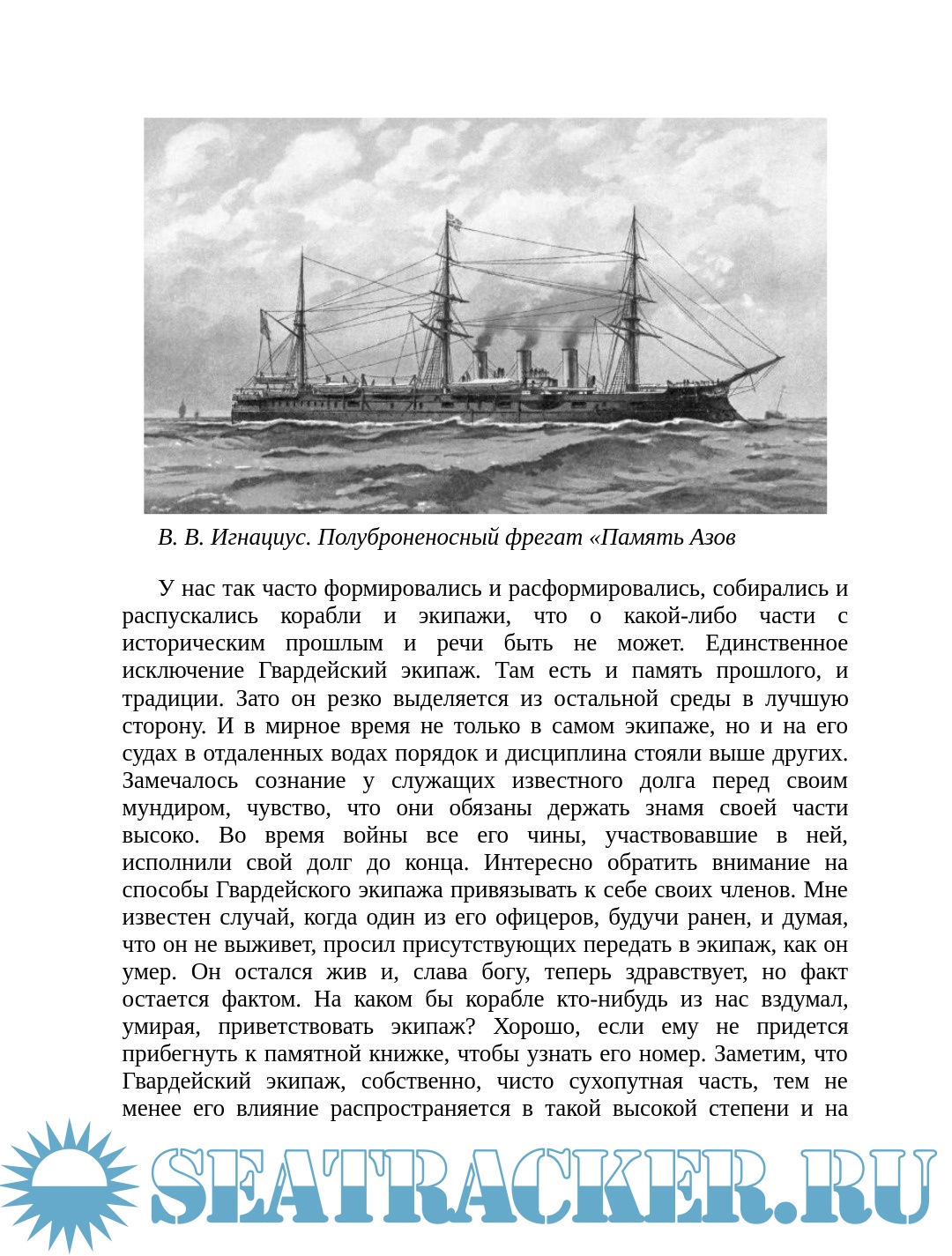 «Для каждого моряка слова «корабль», «эскадра», «флот» – не простые слова <…>. Каждое судно – это воплощение семьи для морского офицера, это его дом; <…> море – его стихия, зачастую сердитая, но родная, без которой настоящий моряк жить не может…» – И. А. Кононов.