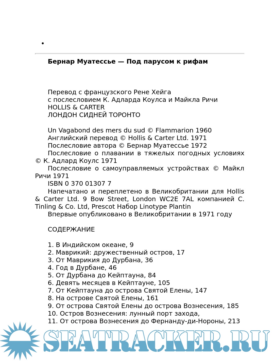 Описание: Перевод любительский. - С оригинала: Sailing to the Reefs. London: Hollis & Carter Ltd. 1971. – 288 p. + index. С иллюстрациями.