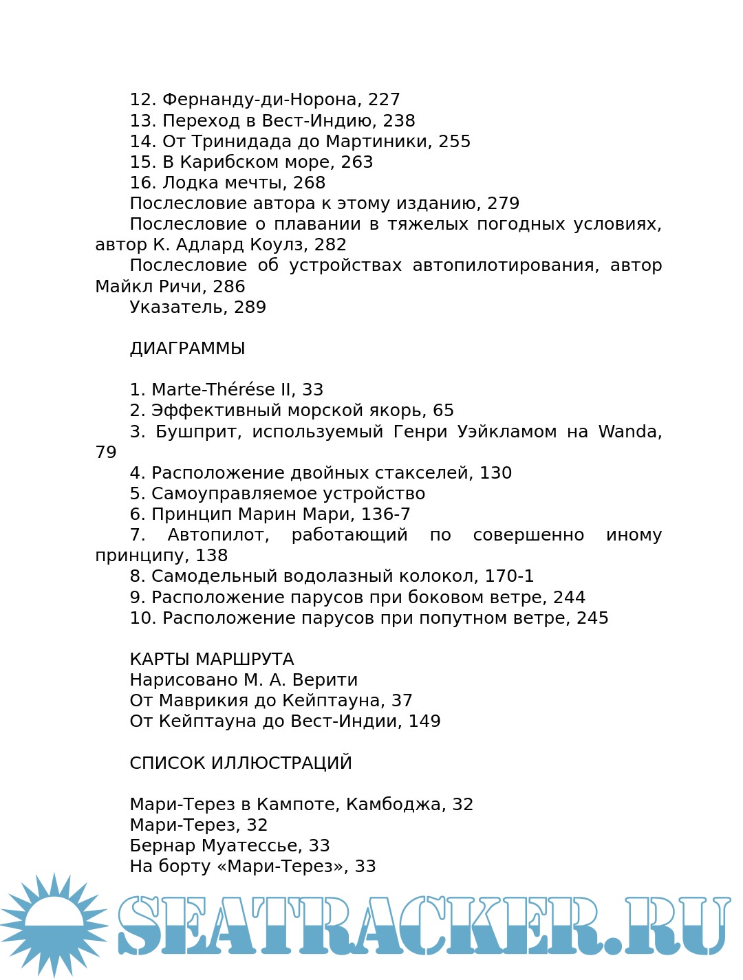 Год выпуска: 1971 Язык: Русский Автор: Муатесье Б. Жанр: История Издательство: 1971 ISBN: 0 370 01307 7 Формат: PDF, ePUB Качество: Изначально компьютерное (eBook) Количество страниц: 326 Описание: Перевод любительский. - С оригинала: Sailing to the Reefs. London: Hollis & Carter Ltd. 1971. – 288 p. + index. С иллюстрациями. Бернар Муатесье (Bernard Moitessier )(1925 — 1994) — французский яхтсмен , наиболее известный своим участием в гонке Sunday Times Golden Globe Race 1968 года , первой безостановочной одиночной кругосветной яхтенной гонке. Это его первая книга, французское название «Un Vagabond des mers du sud» Flammarion 1960, в ней описывается его одиночное плавание (1952-1957 г.г.) на парусной лодке «Мари Тереза» из Индокитая к о. Диего-Гарсия и после крушения, о постройке новой лодки «Мари Тереза II» на Маврикии и продолжении плавания через Южную Африку, о. Святой Елены, о. Вознесения к Карибским островам, где снова произошло крушение на рифах.