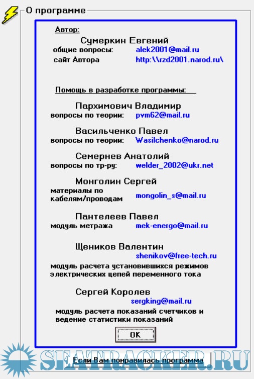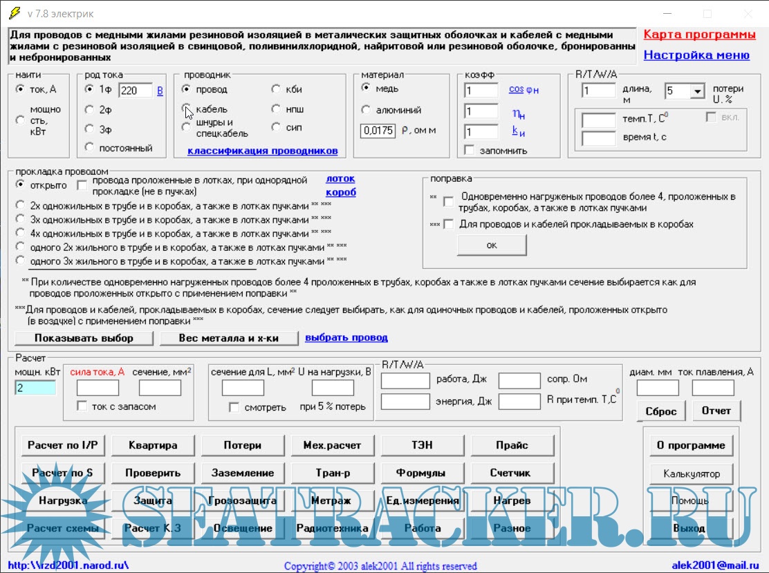 Год выпуска: 2014 Версия: 7.8 Разработчик: [email protected] Платформа: Windows Совместимость с 64-битными ОС: да Системные требования: Windows 98/XP/7/10/11 Язык интерфейса: Русский Таблэтка: Не требуется Описание: Электрик 7.8 — специализированная программа для выполнения расчетов в области электроснабжения и электротехники. Приложение предназначено для инженеров, электриков и проектировщиков и охватывает основные задачи подбора оборудования и анализа электрических сетей. Программа выполняет расчет тока, мощности, сопротивления, энергии, падения напряжения и параметров проводников. Реализован выбор проводов и кабелей по ПУЭ и ГОСТ, подбор автоматов защиты, УЗО и плавких вставок. Поддерживаются расчеты электрических нагрузок зданий, коротких замыканий, потерь мощности и электроэнергии. Включены модули расчета заземления, грозозащиты, освещения и схем электроснабжения. Доступны проверки нагрева проводников, допустимых токов и экономической плотности тока. Программа позволяет рассчитывать трансформаторы, нагревательные элементы, параметры линий и электрических цепей переменного тока. Дополнительно доступны справочники, формулы, перевод единиц измерения, расчет стоимости работ и материалов, а также инструменты учета электроэнергии по показаниям счетчиков. !Важно, если у вас появились кракозябры в интерфейсе программы - обязательно установить шрифт, который находится в папке C:\Program Files\cu\sserifer.fon