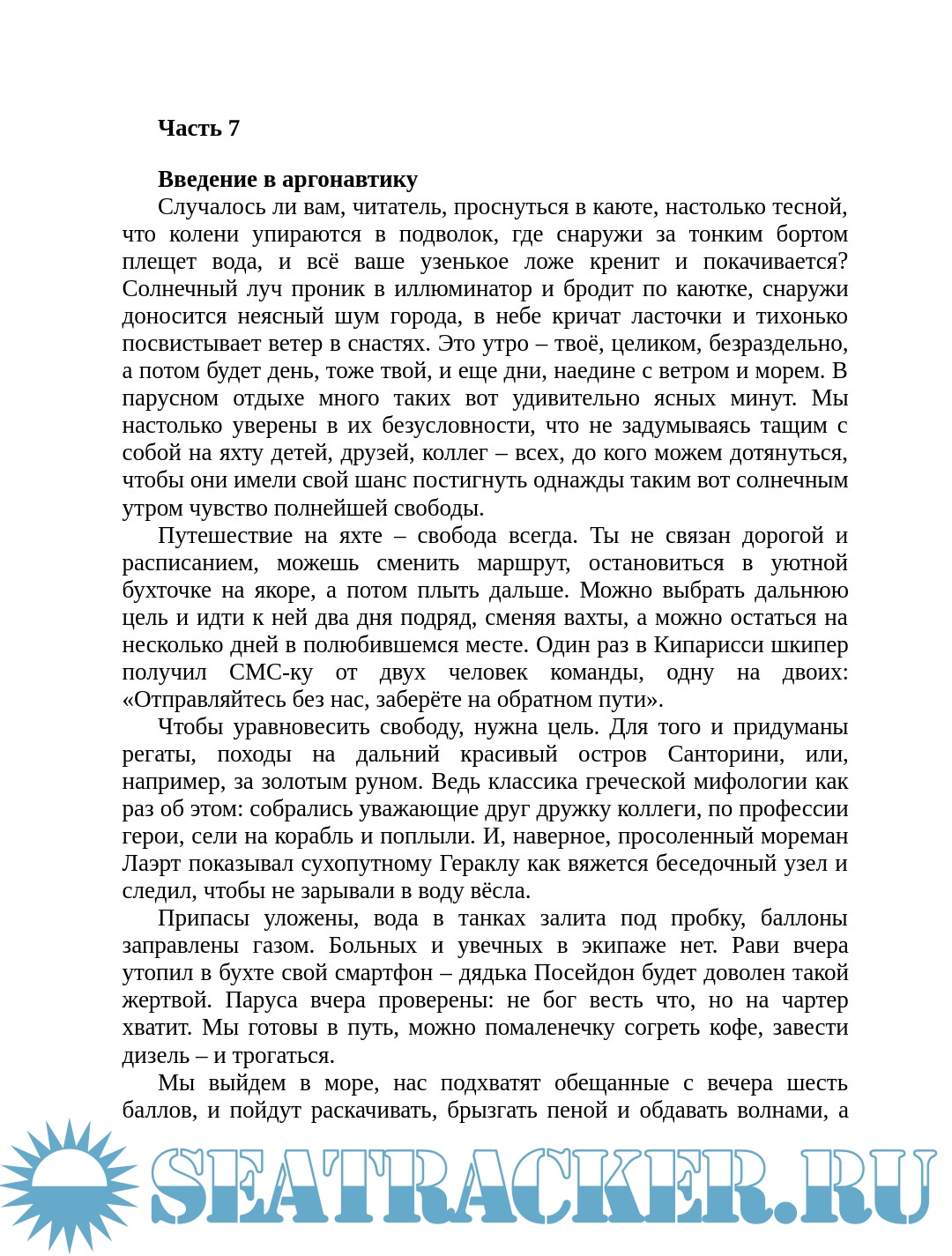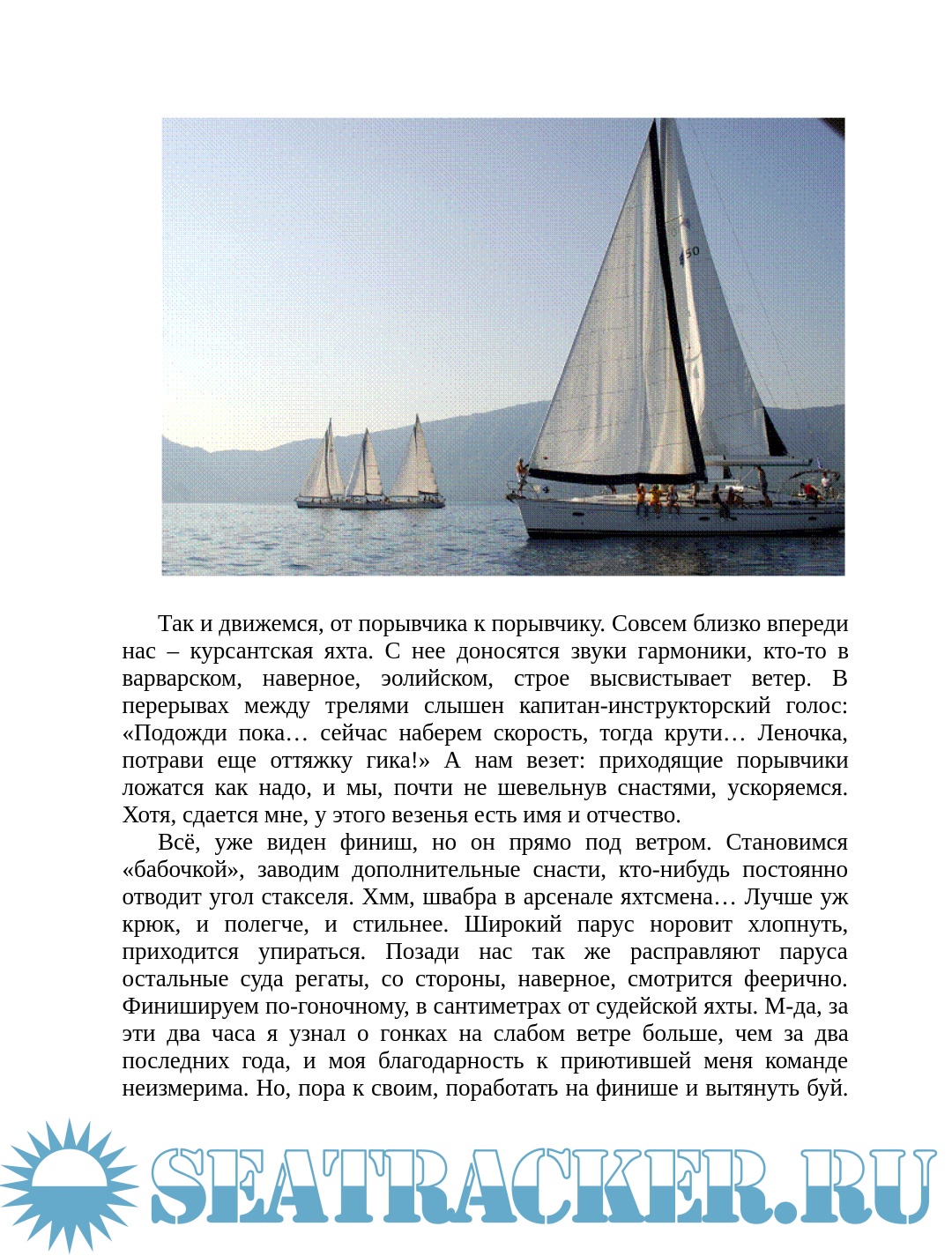 Описание: Случалось ли вам, читатель, проснуться в каюте, настолько тесной, что колени упираются в подволок, где снаружи за тонким бортом плещет вода, и всё ваше узенькое ложе кренит и покачивается? Солнечный луч проник в иллюминатор и бродит по каютке, снаружи доносится неясный шум города, в небе кричат ласточки и тихонько посвистывает ветер в снастях. Это утро – твоё, целиком, безраздельно, а потом будет день, тоже твой, и еще дни, наедине с ветром и морем. В парусном отдыхе много таких вот удивительно ясных минут. Мы настолько уверены в их безусловности, что не задумываясь тащим с собой на яхту детей, друзей, коллег – всех, до кого можем дотянуться, чтобы они имели свой шанс постигнуть однажды таким вот