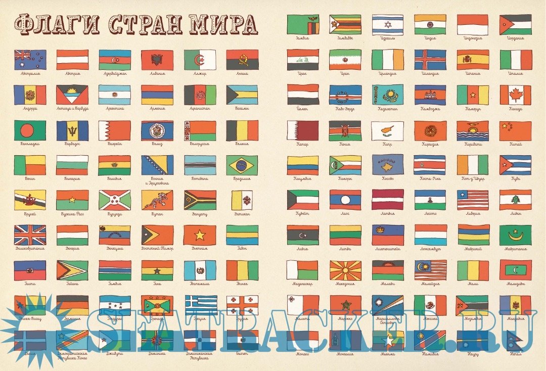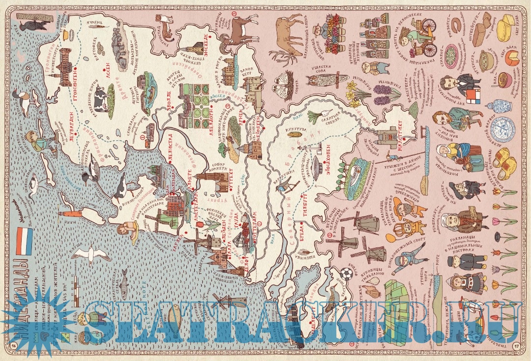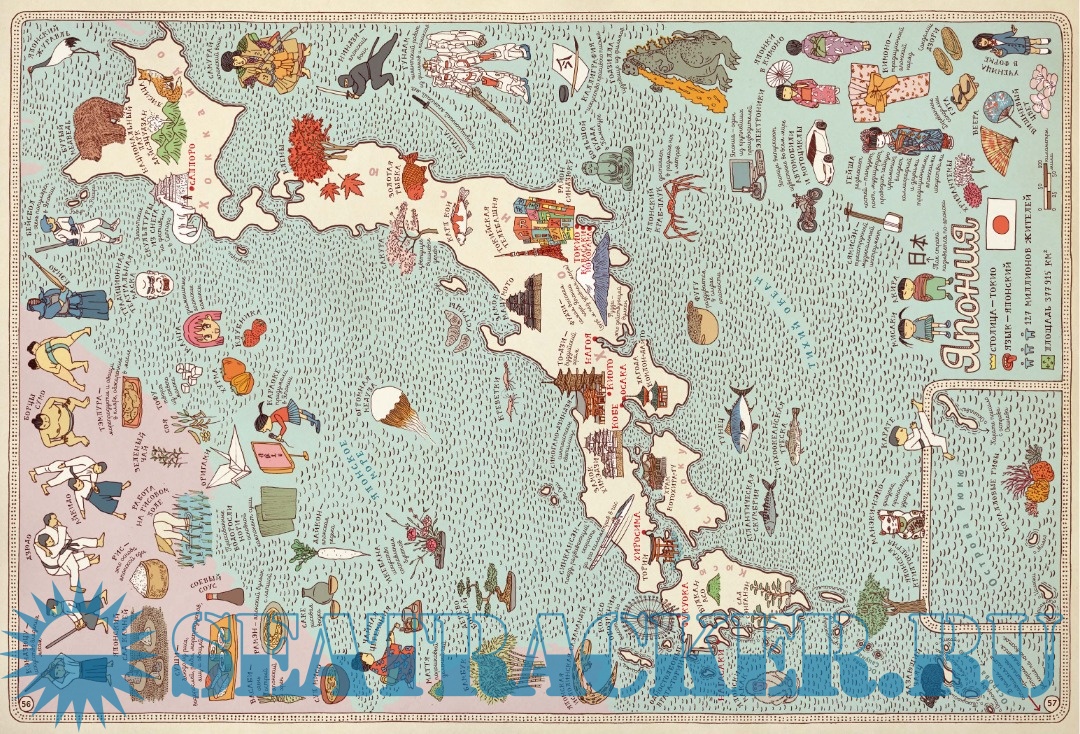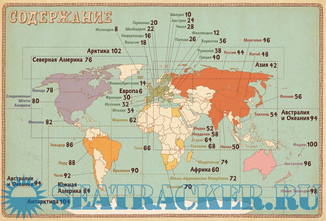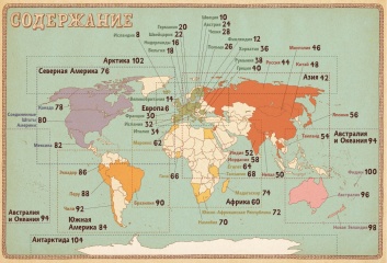 Каждый разворот посвящён отдельной стране или региону и включает: