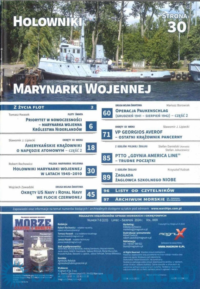 Year: 2024 Language: Polish Author: группа авторов Genre: Periodical (journal) Edition: 2024-09-10 Format: PDF Quality: Scanned pages Pages count: 97 Description: Польский морской журнал. Издается с 1996 года, первоначально как ежеквартальный. С 1999 года издается раз в два месяца, а с 2007 года-как ежемесячный. Первоначально назывался Morza Statki i Okrety, в 2006 году переименован в Morze Statki i Okrety. С 2004 года полностью цветной (ранее только вставки). В 2008 году стали издаваться специальные выпуски, первоначально нерегулярные. С 2014 года выпускается как обычное издание и специальное издание, с непрерывной нумерацией.