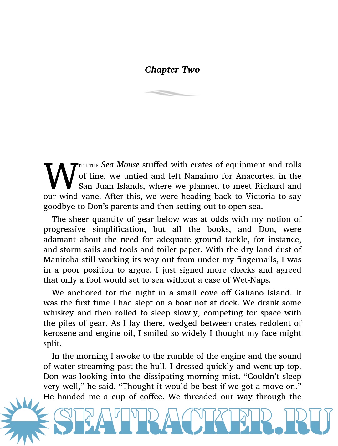 Description: A stint in the army and a broken heart lead Kevin Patterson to the dock of a sailboat brokerage on Vancouver Island, where he stands contemplating the romance of the sea and his heartfelt desire to get away. By the end of the day, he finds himself the neophyte owner of a sailboat called the Sea Mouse. He also has a plan: to sail to Tahiti and back, and burn away his failings in hard miles at sea.