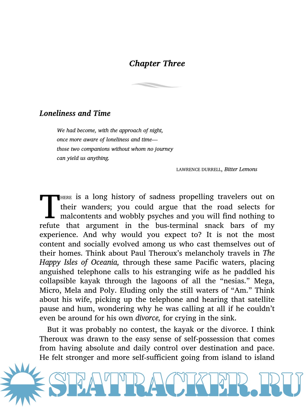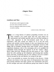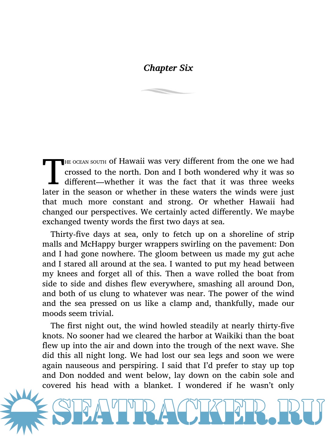 First he recruits a traveling companion, another brokenhearted guy who at least knows how to sail. They set out like the Two Stooges-Seasick and Slapstick. Days without wind are days to kick back on the deck with a beer and a man-versus-nature adventure book that valorizes their journey into an essential quest for manhood. But eventually the voyage begins to take on a sharper edge. On a relentless beat across the South Pacific, they run across one solitary male sailor after another on the lam, not heroes but refugees. Both the literature and the reality of masculine adventure start to pall, and Patterson begins to long for home.