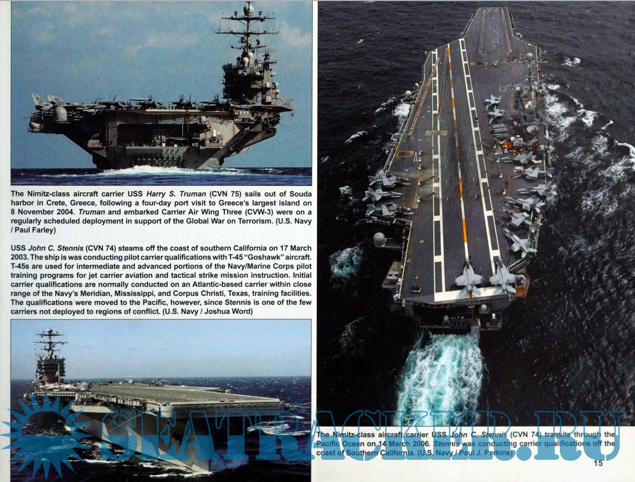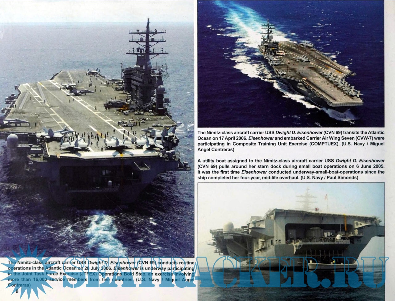 Year: 2009 Language: English Author: Jim Goodall Genre: History of the Navy Publisher: Squadron/Signal Publications Edition: On Deck No. 6 Format: PDF Quality: Scanned pages Pages count: 64 Description: The largest naval vessels in the world are the Nimitz-class super aircraft carriers. The Nimitz (CVN-68) launched the class when it was commissioned on 3 May 1975 and it has been followed by another 9 vessels. Each is more than 1,000 feet long, and displaces 103,000 tons at full load. Carriers are vital to the projection of US power around the globe: USS Nimitz responded to the Iran hostage crisis in the late 1970s, launched raids on Libya in the early 1980s and challenged China's growing navy in the Taiwan Straits in 1996. USS Dwight D. Eisenhower was the first US warship to respond to the Iraqi invasion of Kuwait in August 1990. USS Carl Vinson was the first to launch air attacks as part of Operation Enduring Freedom in Afghanistan. In the mid-1990s USS Theodore Roosevelt supported NATO air strikes against Bosnian Serbs during fighting in former Yugoslavia. USS Abraham Lincoln backed up Operation Iraqi Freedom and Enduring Freedom in Afghanistan in the early 2000s. Illustrated with more than 300 photographs, plus color profiles.