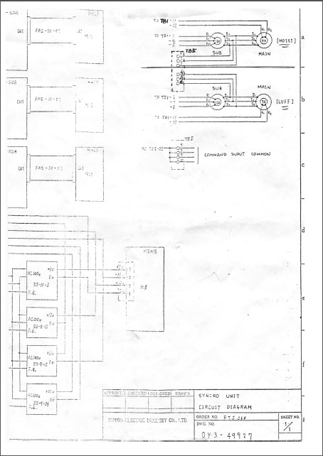 Year: 1983 Language: english Author: NIPPON ELECTRIC INDUSTRY Genre: Instruction manua Publisher: NIPPON ELECTRIC INDUSTRY Format: PDF Quality: Scanned pages Number of pages: 35+72 Description: INSTRUCTION MANUAL FOR TDC CONTROL EQUIPMENT (SYNCHRO-UNIT) JULY 4, 19S3 NIPPON ELECTRIC INDUSTRY CO.,LTD.-CONTENTS 1 . GENERAL.....................................1 5. PRINCIPLE OF OPERATION........................................2 6. IDENTIFICATION OF EACH PART...................................4 7. INSTALLATION AND ADJUSTMENT...................................7 8 . OPERATING PROCEDURES.........................................12 9. TROUBLE SHOOTING ...........................................14 10. SYNCHRO-TRANSMITTER INSPECTION...............................18 11. DC SOURCE INSPECTION.........................................19 12. RELAY REPLACING METHOD......................................2 0 13. CARD REPLACING METHOD........................................21 14. TEST FUNCTIONS................................................. 2 3-1 . GENERAL This equipment is used for controlling KDIST and LUFFING functions of the Twin-Deck CraneAMAIN and SUB crane. For HOIST and LUFF functions, the equipment carries out a synchronous control. 5. PRINCIPLE OF OPERATION 5.1 Method of Synchronous Control When a control of identical speed is given to Main Crane (hereinafter called main) and to Sub-Crane (hereinafter called sub) from the control lever, if the speed characteristics of the main are different from those of sub, a deviation is produced in the position of two cranes When the deviation is smaller than certain value (Speed compensation dead zone), a signal from the control lever will be outout as it is. When the deviation is larger than certain value, a compensation will be added to the speed control instructi ri in cr : :c aiike the deviation smaller. In case of Fig. 1, the main lags behind the sub in the direction of travelling, so the value corresponding :o (speed :r.strJ: tion) + (compensation) will be given to main as instruction val:e. On the contrary, since the sub advances more t lan the main, it will receive (speed instruction) - (compensation) instruction. In twin-operation node, the synchro-trar.. .ir.itter JeiActi a deviation between the main crane and sub-crane. The deviation is converted into speed compensation signal in synchro unit, then added to or subtracted from the speed instruction signal given by the control lever, and is output as a speed signal. Also, when the deviation between the mair and sub becomes larger than a set value (stop point), stop signal will be issued as the synchronism is no more available.