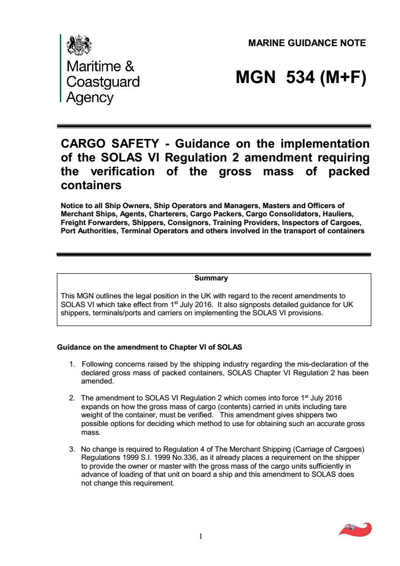 SOLAS amendment requiring the verification of the gross mass of packed containers will take effect from 1st July 2016. This MGN outlines the legal position in the UK with regard to the recent amendments to SOLAS. MCA MGN 534 guidance on the implementation of the SOLAS VI Regulation 2 amendment requiring the verification of the gross mass of packed containerswhich will take effect from 1st July 2016 as well.