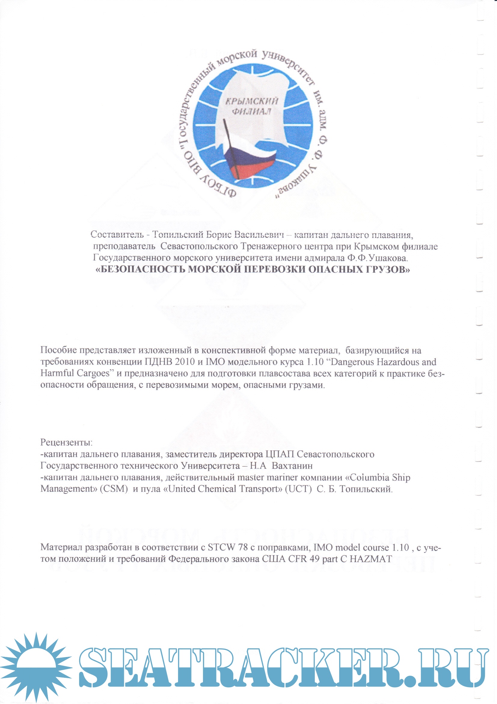 Доп. информация: Материал разработан в соответствии с STCW 78 с поправками, IMO model course 1.10, с учетом положений и требований Федерального закона США CFR49 part C HAZMAT.