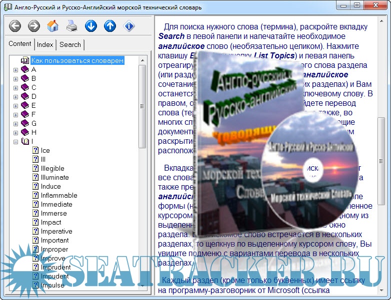 Особенностью Словаря является наличие комментариев, иллюстраций и пояснений ко многим специальным морским терминам, а также возможность услышать, как произносится английское слово или выражение - ссылка "Произношение" имеется в каждом разделе Словаря. В последней версии Словаря добавлен список неправильных глаголов английского языка.