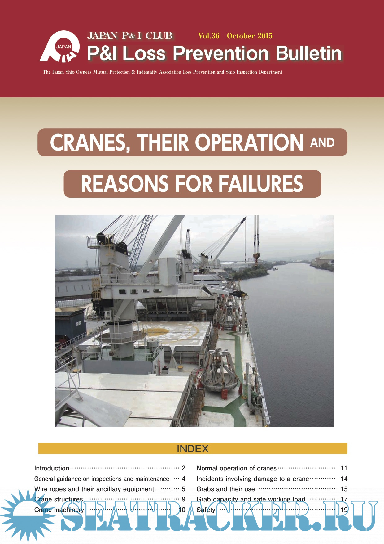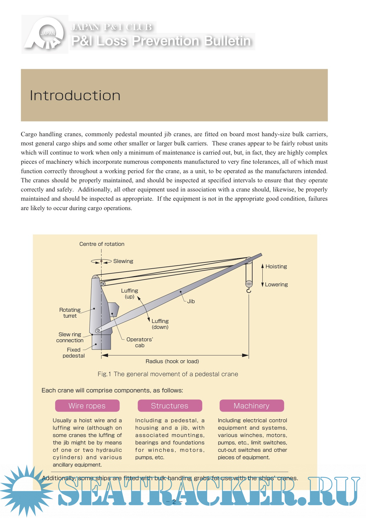 Description: Cargo handling cranes, commonly pedestal mounted jib cranes, are fitted on board most handy-size bulk carriers, most general cargo ships and some other smaller or larger bulk carriers. These cranes appear to be fairly robust units which will continue to work when only a minimum of maintenance is carried out, but, in fact, they are highly complex pieces of machinery which incorporate numerous components manufactured to very fine tolerances, all of which must function correctly throughout a working period for the crane, as a unit, to be operated as the manufacturers intended. The cranes should be properly maintained, and should be inspected at specified intervals to ensure that they operate correctly and safely. Additionally, all other equipment used in association with a crane should, likewise, be properly maintained and should be inspected as appropriate. If the equipment is not in the appropriate good condition, failures are likely to occur during cargo operations.