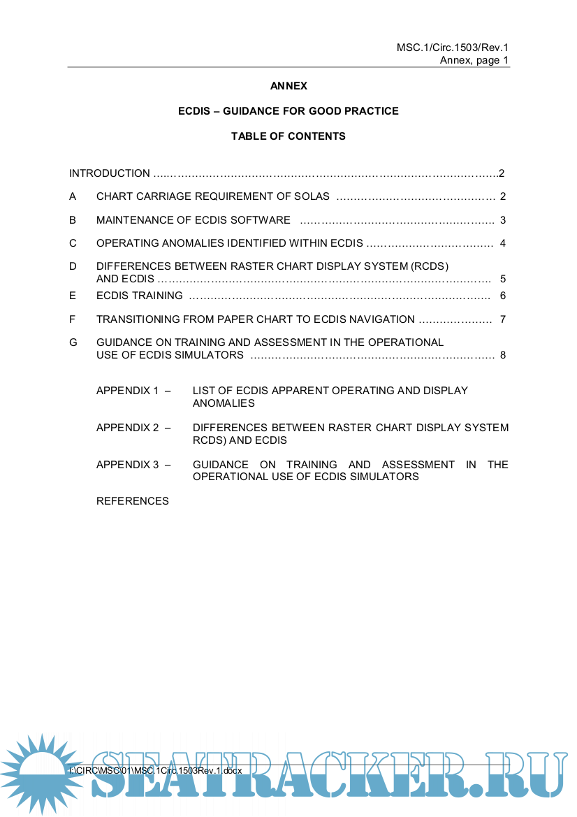 Year: 2017 Language: english Author: IMO Genre: Guide Publisher: IMO Edition: 16 June Format: PDF Quality: eBook Pages count: 25 Description: The Maritime Safety Committee, at its ninety-fifth session (3 to 12 June 2015), approved the ECDIS – Guidance for Good Practice, drawing together relevant guidance from seven previous ECDIS circulars into a single, consolidated document. The consolidated guidance termed "ECDIS – Guidance for Good Practice" is set out in the annex to this circular (referred to as "Guidance" hereafter). Ship operators, masters and deck officers on ECDIS-fitted ships are encouraged to use this guidance to improve their understanding and facilitate safe and effective use of ECDIS. Members of the Organization and all Contracting Governments to the SOLAS Convention are invited to bring this circular to the attention of all entities concerned. In particular, port States are invited to make the guidance available to their port State control inspectors, and flag States to shipowners, masters, recognized organizations, flag State control inspectors and surveyors. This circular revokes MSC.1/Circ.1391, MSC.1/Circ.1503 and Corrigenda 1, SN.1/Circ.207/Rev.1, SN.1/Circ.266/Rev.1, SN.1/Circ.276, SN.1/Circ.312, STCW.7/Circ.10 and STCW.7/Circ.18.