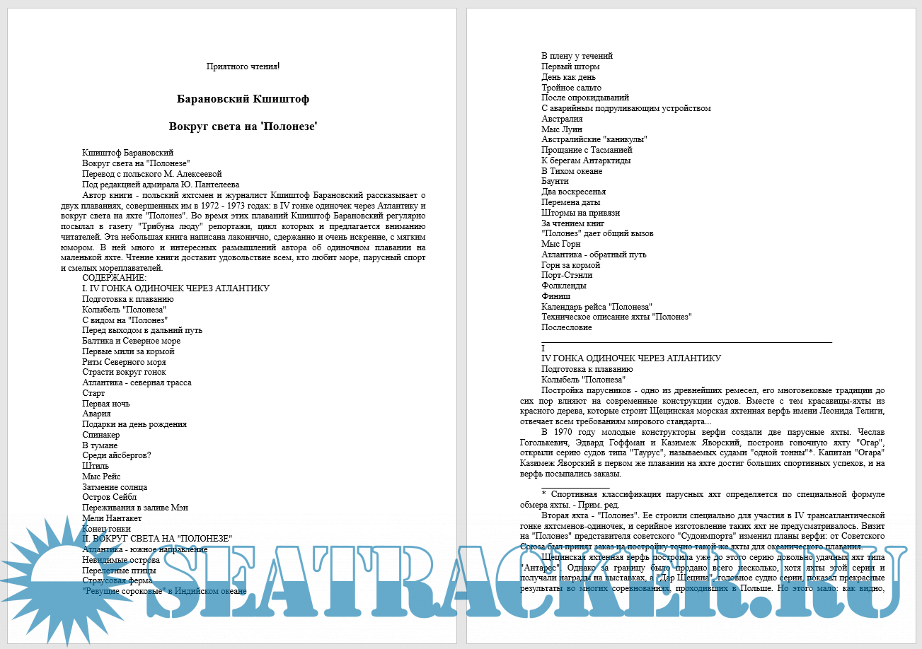 Описание: Автор книги - польский яхтсмен и журналист Кшиштоф Барановский - рассказывает о двух плаваниях, совершенных им в 1972 - 1973 годах: в IV гонке одиночек через Атлантику и вокруг света на яхте "Полонез". Во время этих плаваний Кшиштоф Барановский регулярно посылал в газету "Трибуна люду" репортажи, цикл которых и предлагается вниманию читателей. Эта небольшая книга написана лаконично, сдержанно и очень искренне, с мягким юмором. В ней много и интересных размышлений автора об одиночном плавании на маленькой яхте.