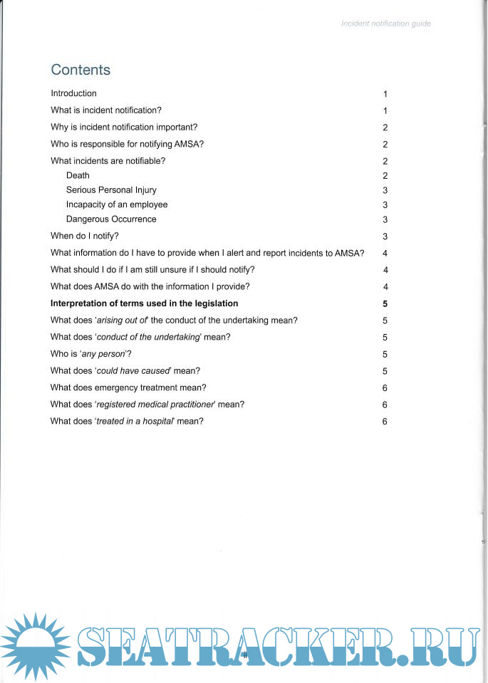 Year: 2011 Language: english Author: Australian Government Genre: Guide Publisher: Australian Maritime Safety Authority Format: PDF Quality: Scanned pages Pages count: 9 Description: Incident Notification Guide under the Occupational Health & Safety Act (Maritime Industry) Act 1993. Additional info: Doc was found in the condition AS IT IS. Unfortunately the 1st page with Introduction is missing.