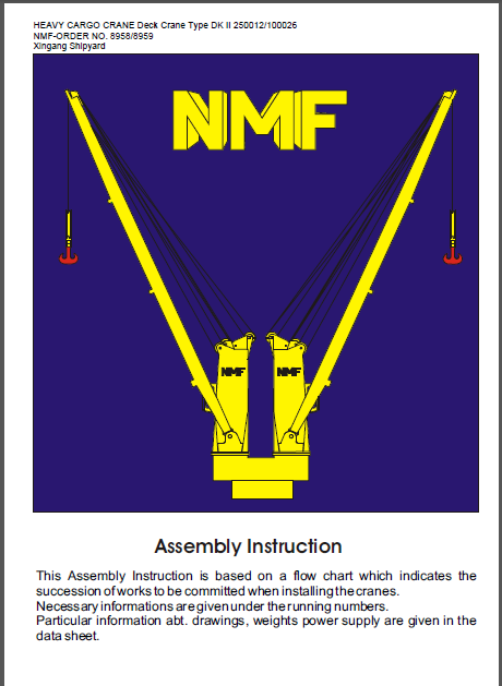 Assembly Instruction This Assembly Instruction is based on a flow chart which indicates the succession of works to be committed when installing the cranes. Necessary informations are given under the running numbers. Particular information abt. drawings, weights power supply are given in the data sheet. Assembly Instruction HEAVY CARGO CRANE Deck Crane Type DK II 250012/100026 NMF-ORDER NO. 8958/8959 Xingang Shipyard Flow Chart and Content 1 Data Sheet 3 2 Preparation of the columns and cranes 4 2.1 All materials of „Energy Supply“ to be stowed in the column. see drawing no: 820-9000-15(1) 4 2.2 All bolts, washer and nuts to be stowed in the column. This material is packed per crane in wooden boxes. 4 2.3 Clean top-flange upper-side, downside, if requested, check evenness of the top-flange. 5 2.4 Arrange light, compressed air, electricity, welding equipment, all necessary tools in the column. 6 2.5 Unpack crane houses, clean bottom flanges, prepare shackles and sling materials. 7 2.6 Crane to be hooked on and to be erected. Put the crane house on wooden gratings. 13 2.7 The cranes are delivered without hydraulic oil. The oil is to be filled in, through connection "DRAIN" in the hydraulic oil tank. 14 2.8 Turning gear to prepared as per instruction. before installing the jib, the crane is to be turned exactly into the direction of the jib´s support. 18 3 Installation of the cranes and jibs on the vessel 21 3.1 For the installation of the jib, it is necessary to have the foot- bearings access able. Platforms must be arranged accordingly.The crane is to be turned into the right position, in order to meet the jibs resting support. 22 3.2 Jib to be installed. 25 4 Installation of the energy-supply and access ladders 27 4.1 Junction box to be placed in the crane´s column. Cable tracks to be installed. See drawing 820-9000-15(1) 27 4.2 Slip ring construction to be installed as per instruction. 27 4.3 Electric cable installation to be carried out, following electric diagram 29 4.4 Pretension of the foundation bolts to be carried out, by means of hydraulic tools, following the instruction. 30 5 Commission the crane 34 5.1 Electric supply, temporary or final to be arranged. 34 5.2 All oil levels to be checked. 34 5.3 Commission crane, following the instruction, given by NMF service engineers. 34 HEAVY CARGO CRANE Deck Crane Type DK II 250012/100026 6 General Rigging Instructions 35 6.1 General advice for the installation procedure 35 6.2 Unwinding the steel wire rope from a coil 35 6.3 Unwinding the steel wire rope from a reel 36 6.4 Installation procedure 39 6.5 Winding the steel wire rope from the reel onto a drum 39 7 Rigging the crane 42 8 Crane Adjustment Function Check 53 9 Final load - test under supervision of the classification society and following the requirements of the surveyor. 55 10 Table of Illustration 56