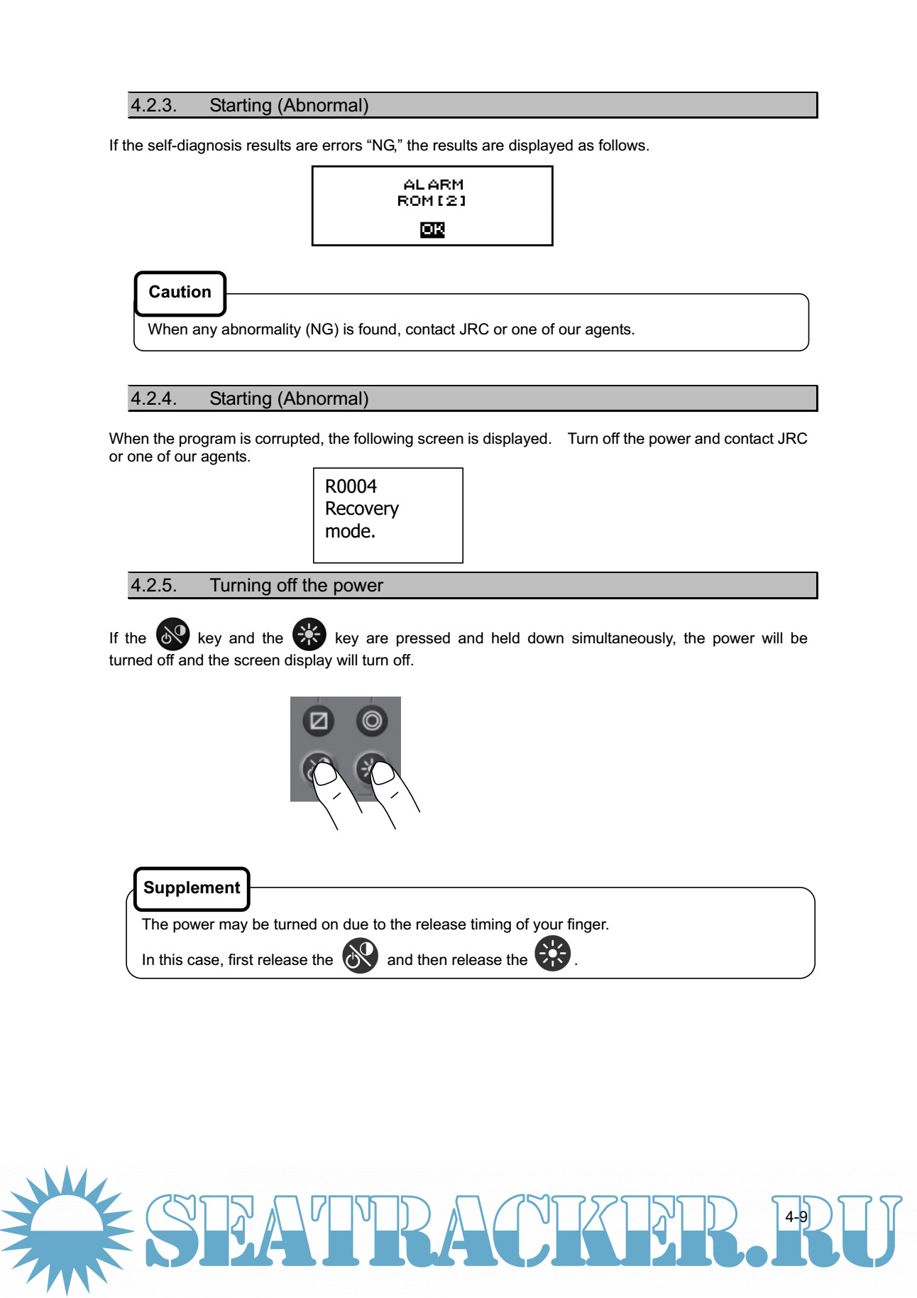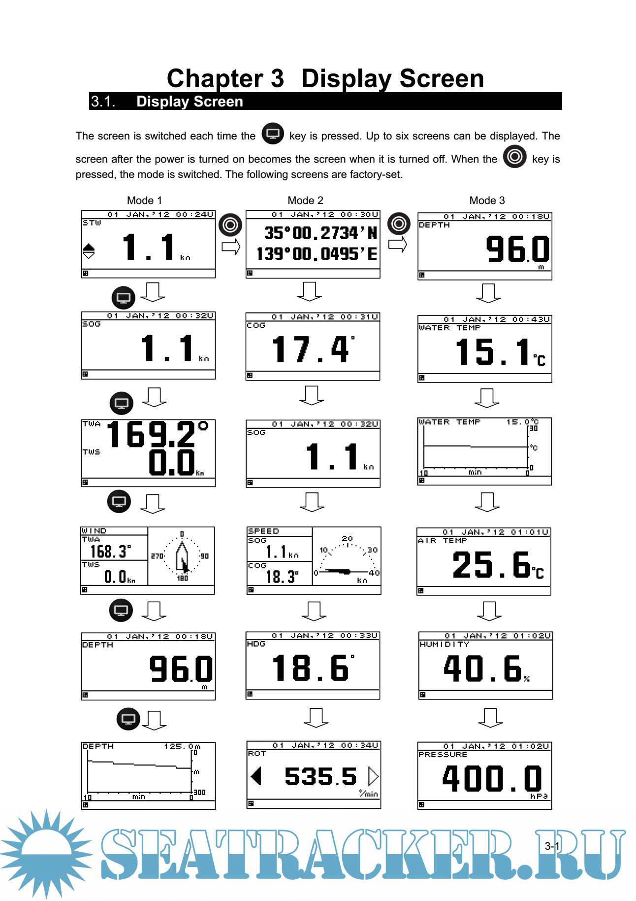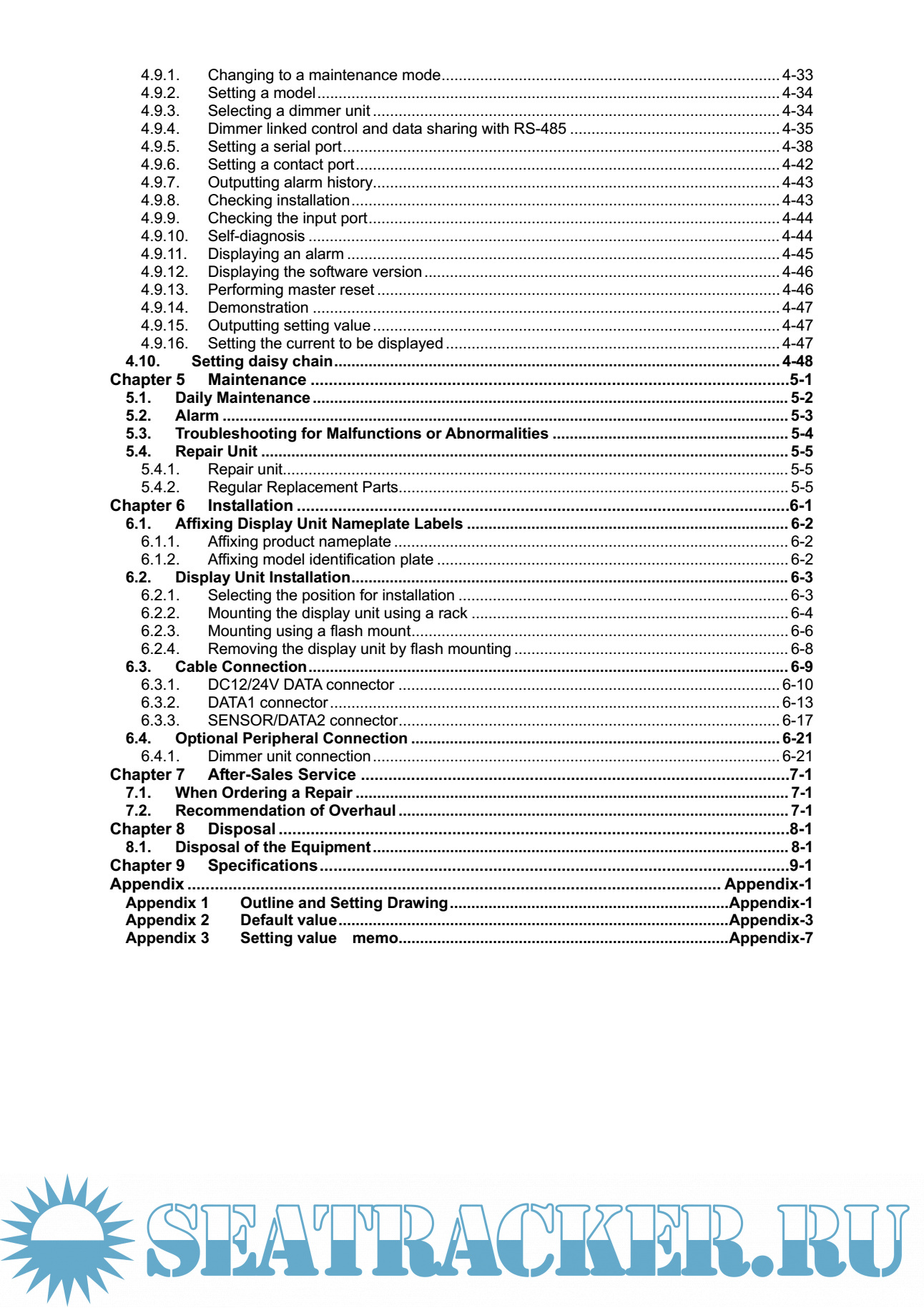 Year: 2013 Language: english Author: JRC Genre: Manual Publisher: JRC Edition: 2 Format: PDF Quality: eBook Pages count: 120 Description: The Multi Information Display (MID) is the display unit that receives NMEA data items from various sensors to display them. The screen can be split to up to 4 areas for use. Only necessary information can be displayed by selecting data to be displayed in the areas. There are three modes in which six screens can be registered, and up to 18 screens can be registered. Features NWZ-4610 Multi Information Display (MID) has the following features: 1) Display of various NMEA data items 2) Selection of display contents and screen layout 3) Distribution of power supply in daisy chain mode 4) Selection of display screen in each mode 5) Sharing of data and interlocking of dimmer between display units at RS-485 interface