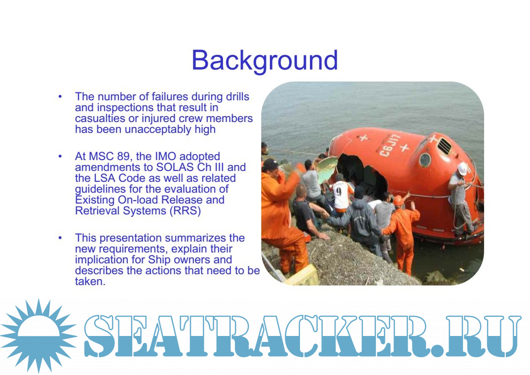At the 89th session of the Maritime Safety Committee (MSC 89) in May 2011, the IMO adopted amendments to SOLAS Chapter III and the LSA Code, as well as related Guidelines for the Evaluation of Existing On-load Release and Retrieval Systems (OLRRS).