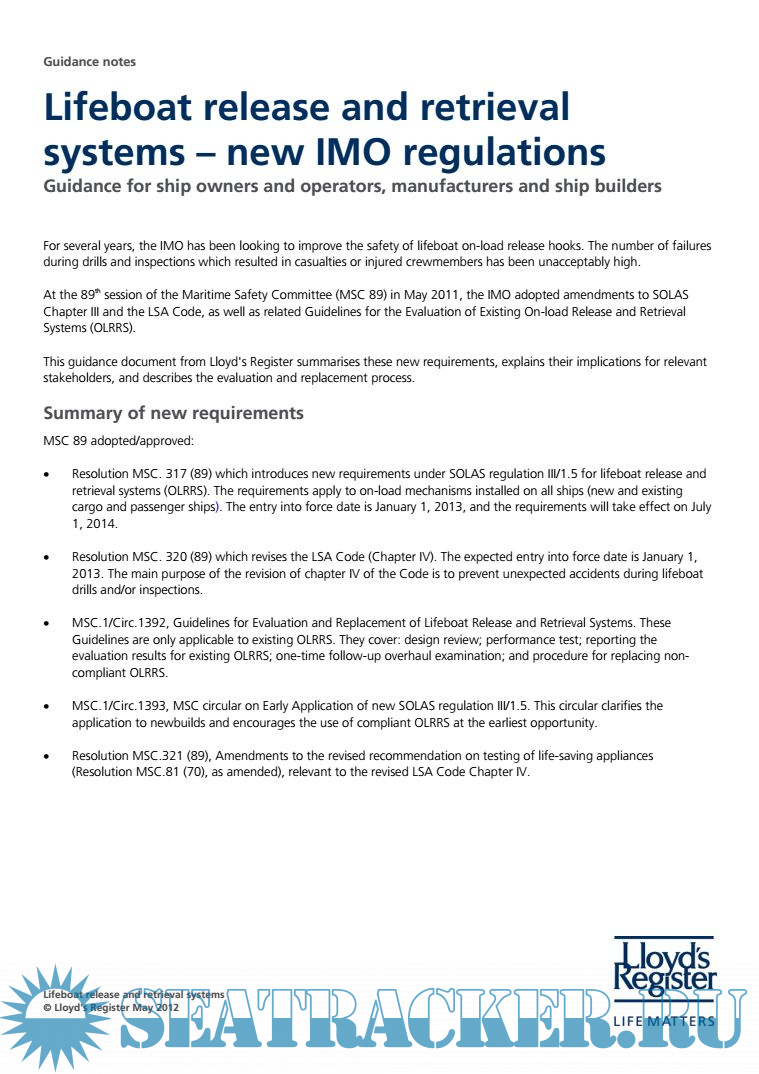 - LR Lifeboat Release and Retrieval Systems Requirements - Guidance for shipowners (2012).