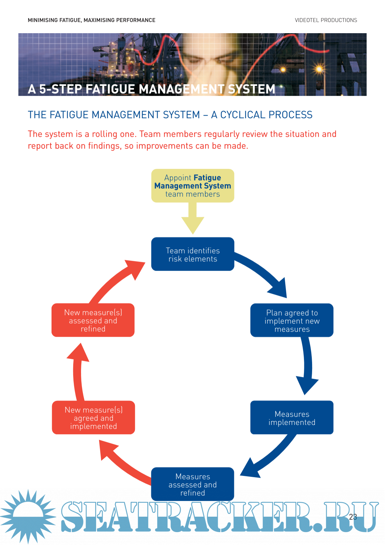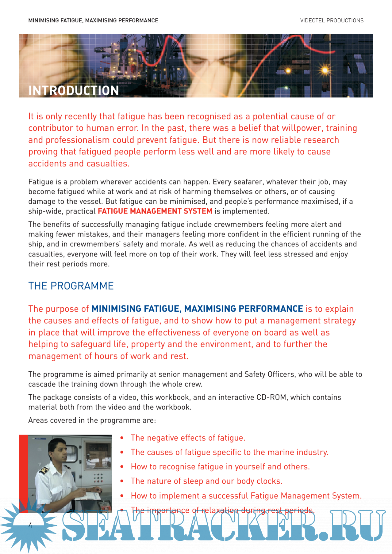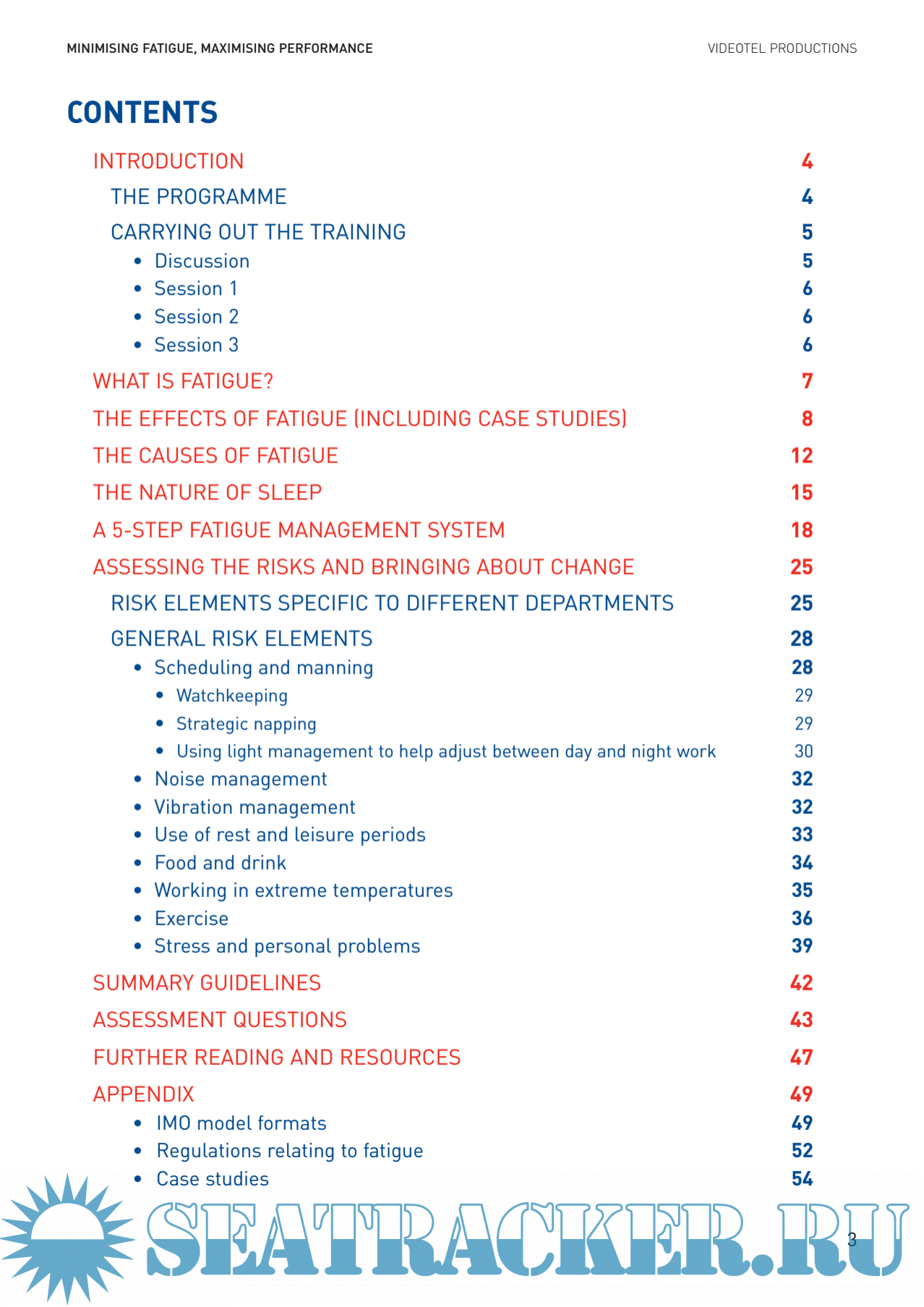 Description: Fatigue is a problem wherever accidents can happen. Every seafarer, whatever their job, maybecome fatigued while at work and at risk of harming themselves or others, or of causingdamage to the vessel. But fatigue can be minimised, and people’s performance maximised, if aship-wide, practical FATIGUE MANAGEMENT SYSTEM is implemented.The benefits of successfully managing fatigue include crewmembers feeling more alert andmaking fewer mistakes, and their managers feeling more confident in the efficient running of theship, and in crewmembers’ safety and morale. As well as reducing the chances of accidents andcasualties, everyone will feel more on top of their work. They will feel less stressed and enjoytheir rest periods more