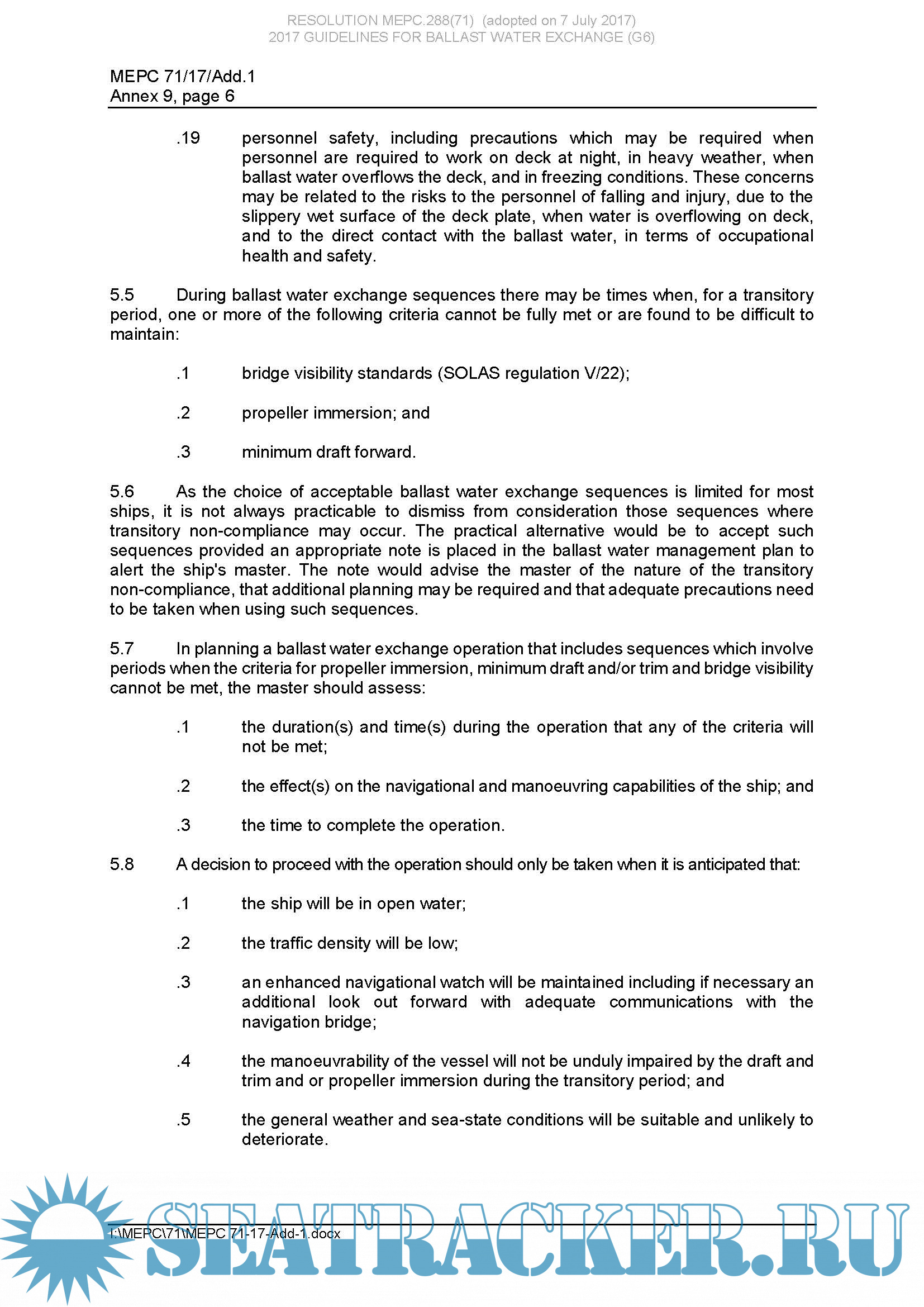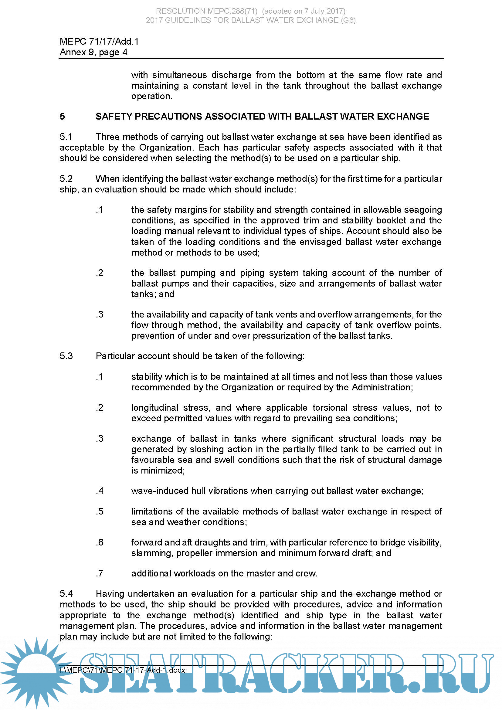 Description: The purpose of these Guidelines is to provide shipowners and operators with general guidance on the development of ship specific procedures for conducting ballast water exchange. Whenever possible shipowners and operators should enlist the assistance of classification societies or qualified marine surveyors in tailoring ballast exchange practices for various conditions of weather, cargo and stability. The application of processes and procedures concerning ballast water management are at the core of the solution to prevent, minimize and ultimately eliminate the introduction of harmful aquatic organisms and pathogens. Ballast water exchange offers a means, when used in conjunction with good ballast water management practices, to assist in achieving this solution.